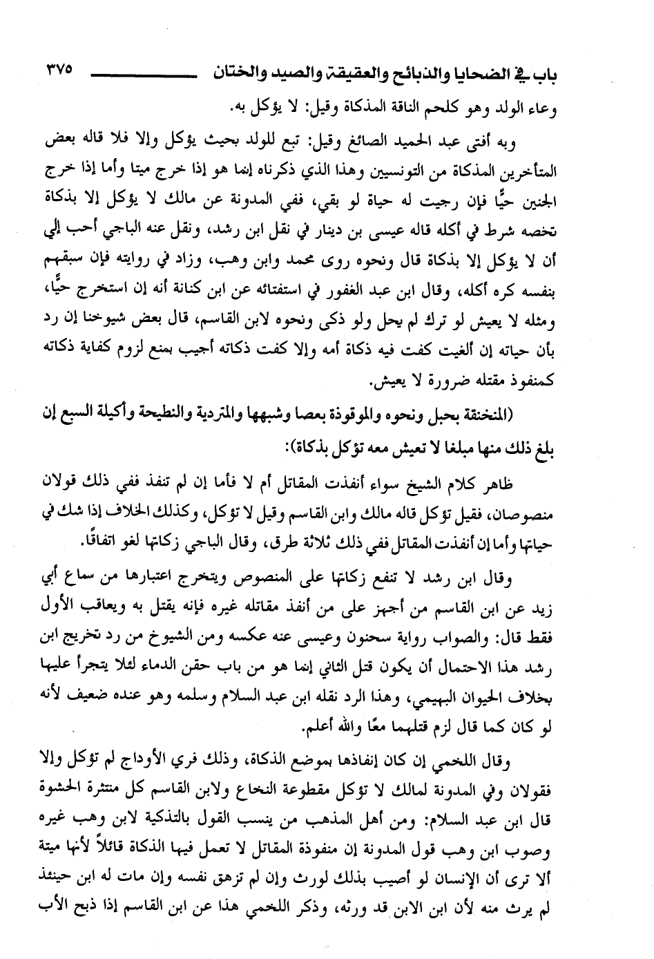 وبه أفتى عبد الحميد الصائغ وقيل: تبع للولد بحيث يؤكل وإلا فلا قاله بعض المتأخرين المذكرة من التونسيين وهذا الذي ذكرناه إنما هو إذا خرج ميتا وأما إذا خرج الجنين حيا فإن رجيت له حياه لو بقي، ففي المدونة عن مالك لا يؤكل إلا بذكاة تخصه شرط في أكله قاله عيسى بن دينار في نقله ابن رشد ونقل عبد الباجي أحب إلي أن لا يؤكل إلا بذكاة قال ونحوه روى محمد وابن وهب، وزاد في روايته فإن سبقهم بنفسه كره أكله، وقال ابن عبد الغفور في استفتائه عن ابن كنانة أنه إن استخرج حيا، ومثله لا يعيش لو ترك لم يحل ولو ذكي ونحوه لابن القاسم، قال بعض شيوخنا إن رد بأن حياته إن ألغيت كفت فيه ذكاة أمه وإلا كفت ذكاته أجيب بمنع لزوم كفاية ذكاته كمنفوذ مقتله ضرورة لا يعيش.