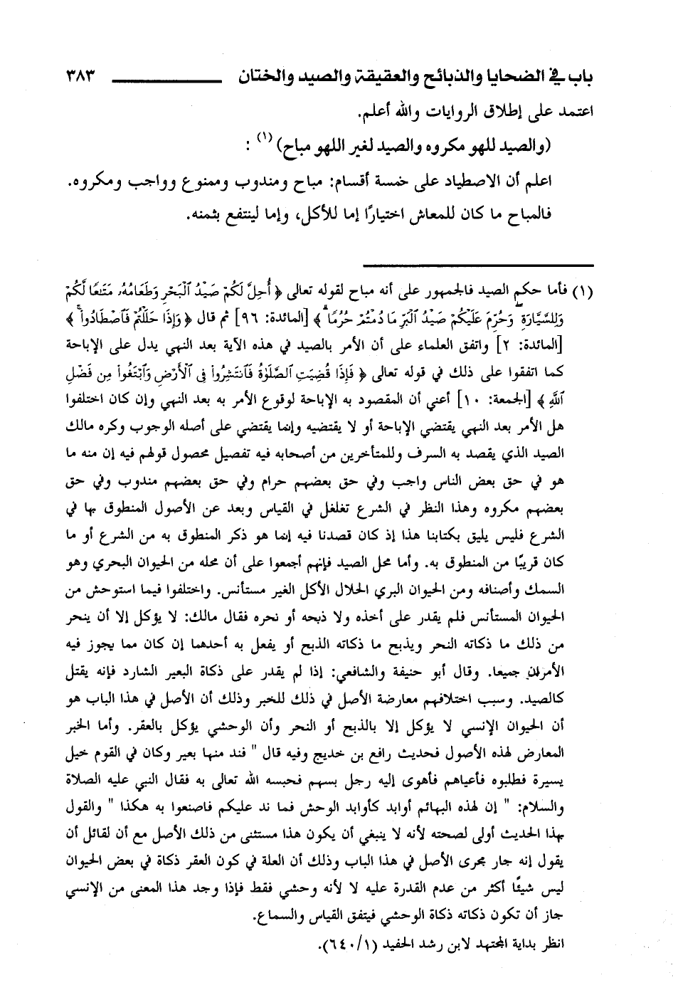 اعلم أن الاصطياد على خمسة أقسام: مباح ومندوب وممنوع وواجب ومكروه.