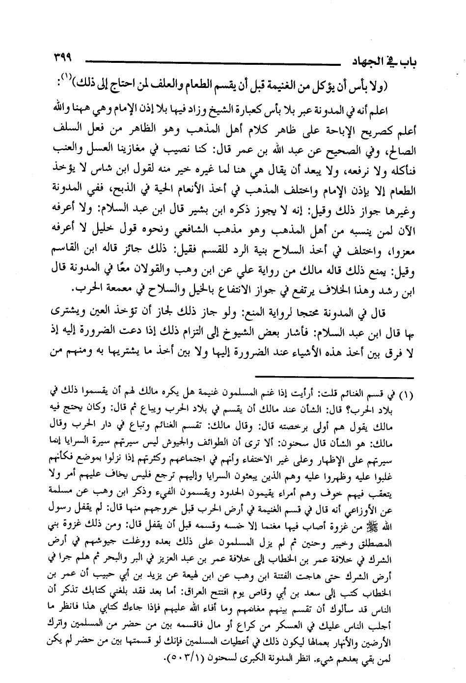 اعلم أنه في المدونة عبر بلا بأس كعبارة الشيخ وزاد فيها بلا إذن الإمام وهي ههنا والله أعلم كصريح الإباحة على ظاهر كلام أهل المذهب وهو الظاهر من فعل السلف الصالح، وفي الصحيح عن عبد الله بن عمر قال: كنا نصيب في مغازينا العسل والعنب فنأكله ولا نرفعه، ولا يبعد أن يقال هي هنا لما غيره خير منه لقول ابن شاس لا يؤخذ الطعام إلا بإذن الإمام واختلف المذهب في أخذ الأنعام الحية في الذبح، ففي المدونة وغيرها جواز ذلك وقيل: إنه لا يجوز ذكره ابن بشير قال ابن عبد السلام: ولا أعرفه الآن لمن ينسبه من أهل المذهب وهو المذهب الشافعي ونحوه قول خليل لا أعرفه معزوا، واختلف في أخذ السلاح بنية الرد للقسم فقيل: ذلك جائز قاله ابن القاسم وقيل: يمنع ذلك قاله مالك من رواية على عن ابن وهب والقولان معًا في المدونة قال ابن رشد وهذا الخلاف يرتفع في جواز الانتفاع بالخيل والسلاح في معمعة الحرب.