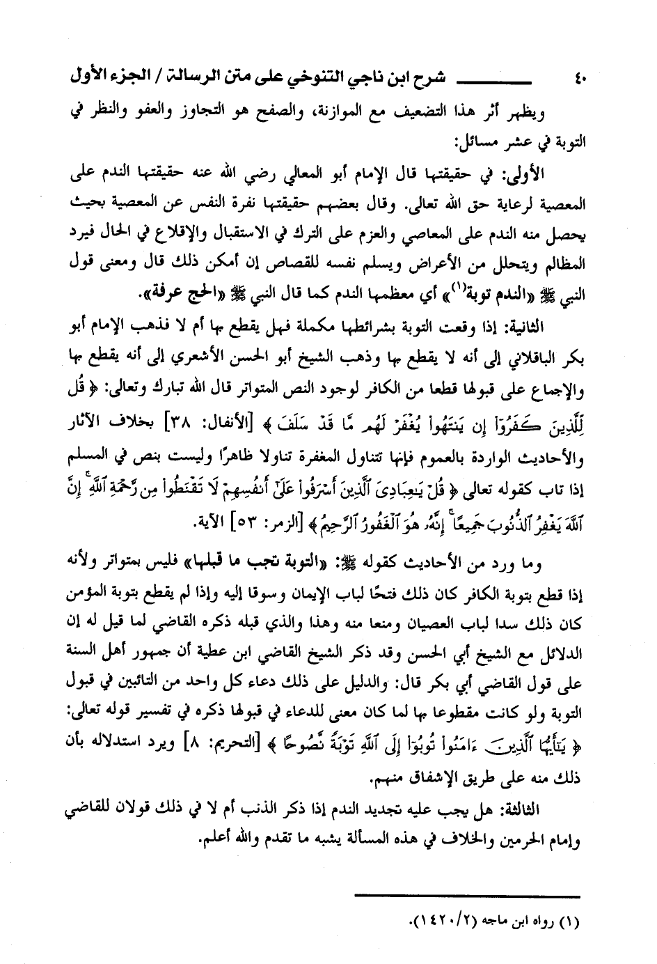 الأولى: في حقيقتها قال الإمام أبو المعالي رضي الله عنه حقيقتها الندم على المعصية لرعاية حق الله تعالى. وقال بعضهم حقيقتها نفرة النفس عن المعصية بحيث يحصل منه الندم على المعاصي والعزم على ترك في الاستقبال والإقلاع في الحال فيرد المظالم ويتحلل من الأعراض ويسلم نفسه للقصاص إن أمكن ذلك قال ومعنى قول النبي صلى الله عليه وسلم "الندم توبة" أي معظمها الندم كما قال النبي صلى الله عليه وسلم "الحج عرفة".