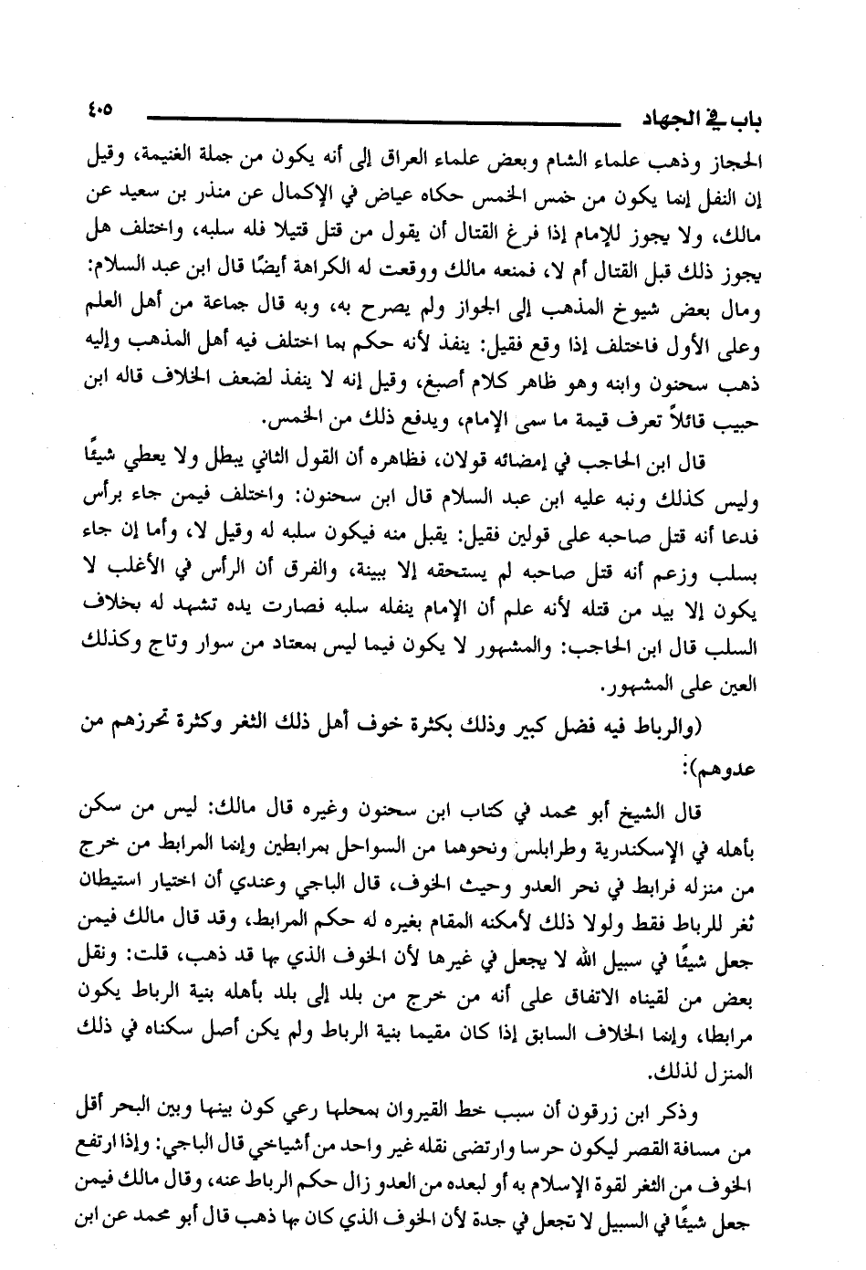 وذكر ابن زرقون أن سبب خط القيروان بمحلها رعي كون بينها وبين البحر أقل من مسافة القصر ليكون حرسا وارتضي نقله غير واحد من أشياخي قال الباجي: وإذا ارتفع الخوف من الثغر لقوة الإسلام به أو لبعده من العدو زال حكم الرباط عنه، وقال مالك فيمن جعل شيئًا في السبيل لا تجعل في جدة لأن الخوف الذي كان بها ذهب قال أبو محمد عن ابن