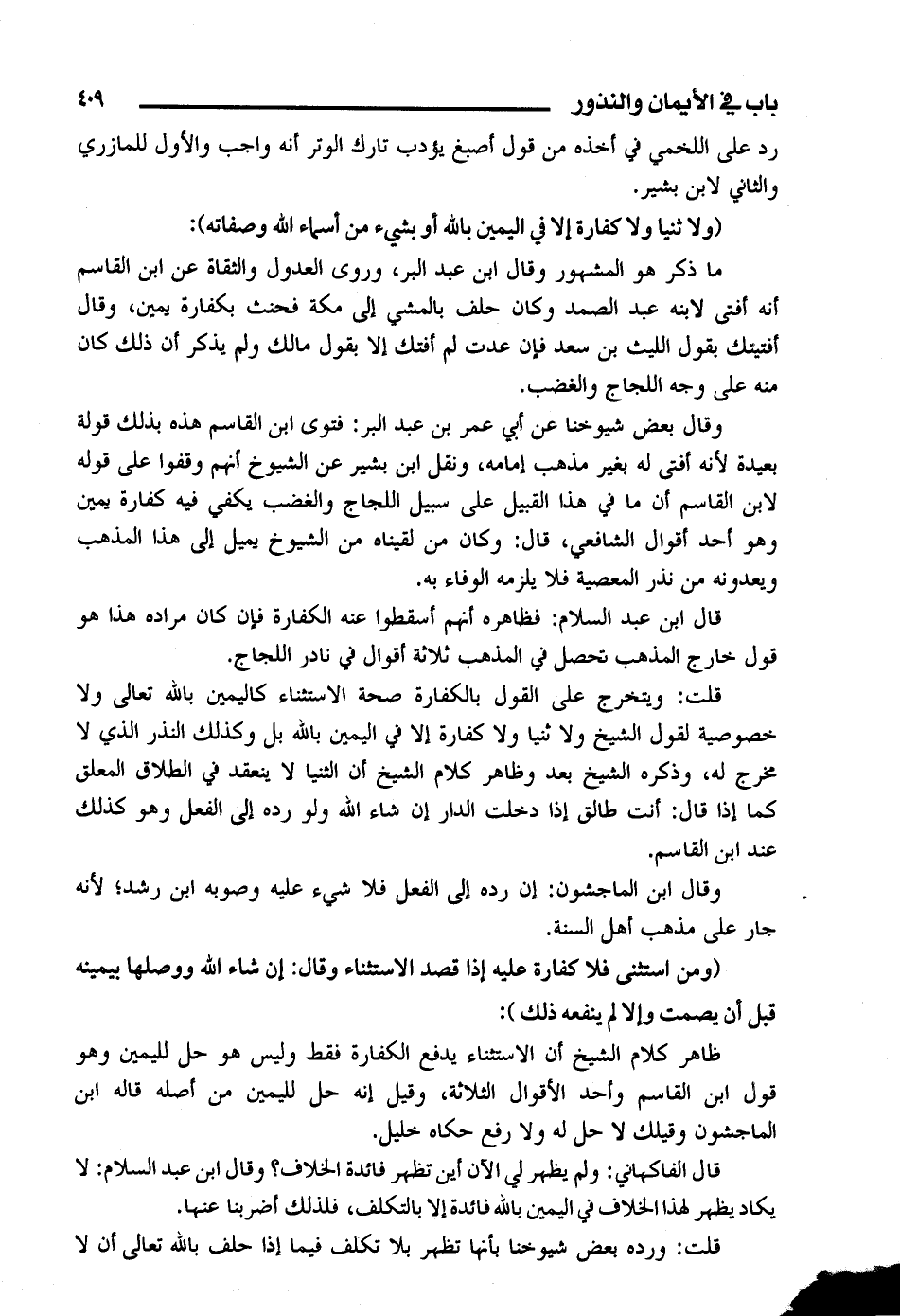 ما ذكر هو المشهور وقال ابن عبد البر، وروى العدول الثقاة عن ابن القاسم أنه أفتى لابنه عبد الصمد وكان حلف بالمشي إلى مكة بكفارة يمين، وقال أفتيتك بقول الليث فإن عدت لم أفتك إلا بقول مالك ولم يذكر أن ذلك كان منه على وجه اللجاج والغضب.