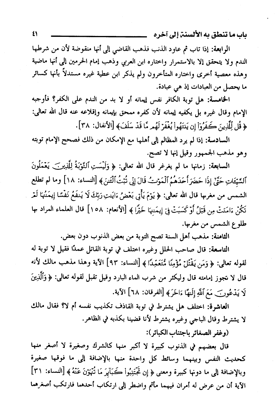الثامنة: مذهب أهل السنة تصح التوبة من بعض الذنوب دون بعض.