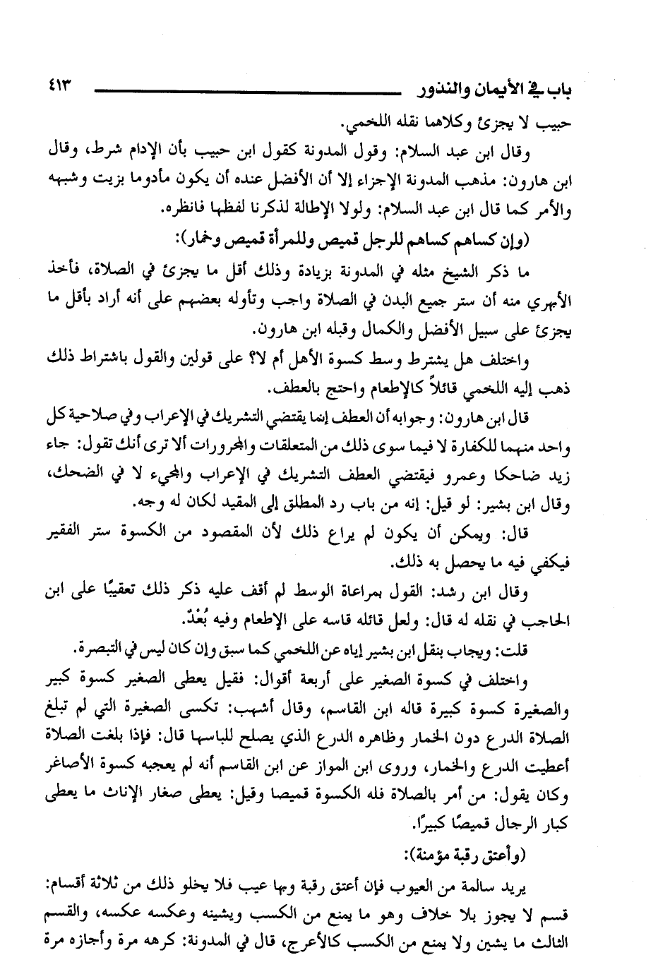 ما ذكر الشيخ مثله في المدونة بزيادة وذلك أقل ما يجزئ في الصلاة، فأخذ الأبهري منه أن ستر جميع البدن في الصلاة واجب وتأوله بعضهم على أنه أراد بأقل ما يجزئ على سبيل الأفضل والكمال وقبله ابن هارون.