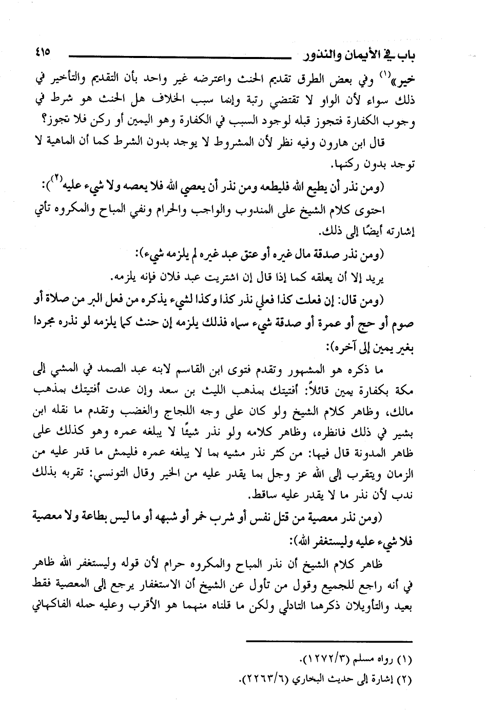 ظاهر كلام الشيخ أن نذر المباح والمكروه حرام لأن قوله وليستغفر الله ظاهر في أنه راجع للجميع وقول من تأول عن الشيخ أن الاستغفار يرجع إلى المعصية فقط بعيد والتأويلان ذكرهما التادلي ولكن ما قلناه منهما هو الأقرب وعليه حمله الفاكهاني