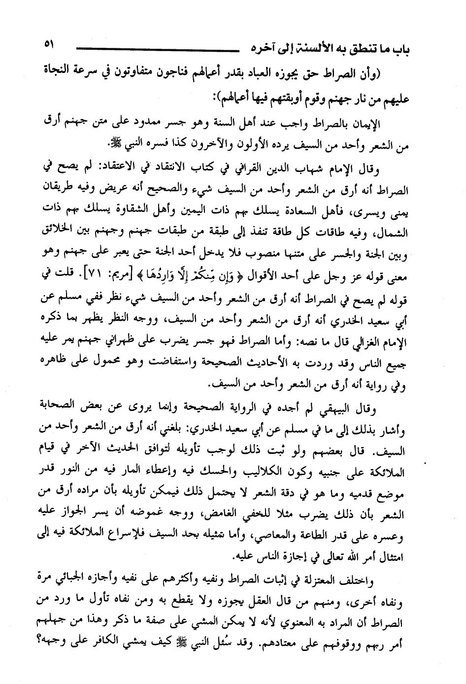 وقال الإمام شهاب الدين القرافي في كتاب الانتقاد في الاعتقاد: لم يصح في الصراط أنه أرق من الشعر وأحد من السيف شيء والصحيح أنه عريض وفيه طريقان يمني ويسرى، فأهل السعادة يسلك يهم ذات اليمين وأهل الشقاوة يسلك بهم ذات الشمال، وفيه طاقات كل طاقة تنفذ إلى طبقة من طبقات جهنم وجهنم بين الخلائق وبين الجنة والجسر على متنها منصوب فلا يدخل أحد الجنة حتى يعبر على جهنم وهو معنى قوله عز وجل على أحد الأقوال (وإن منكم إلا واردها) [مريم: 71]