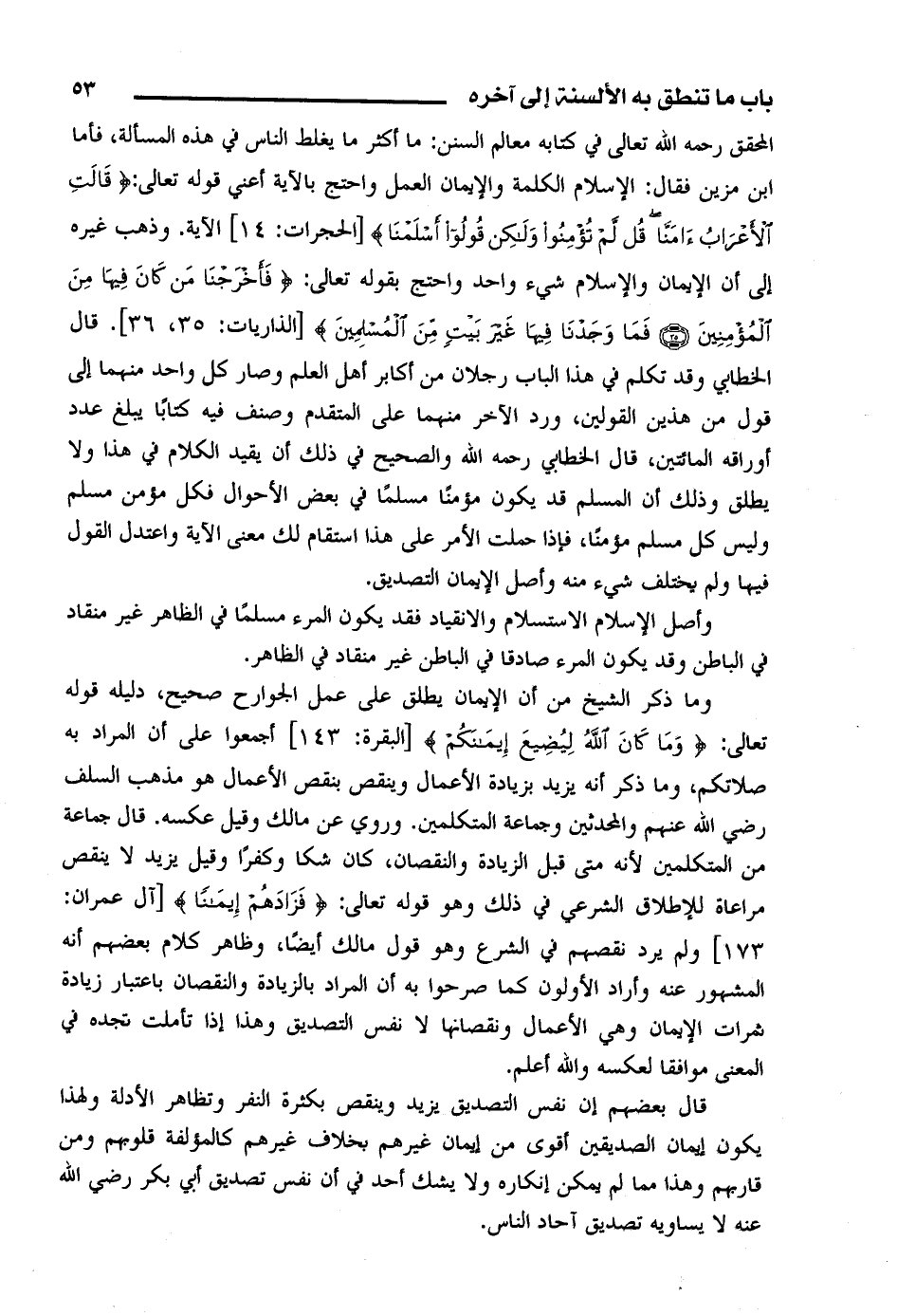 المحقق رحمه الله تعالى في كتابه معالم السنن: ما أكثر ما يغلط الناس في هذه المسألة، فأما ابن مزين فقال: الإسلام الكلمة والإيمان العمل واحتج بالآية أعني قوله تعالى: (قالت الأعراب ءامنا قل لم تؤمنوا ولكن قولوا أسلمنا) [الحجرات: 14]