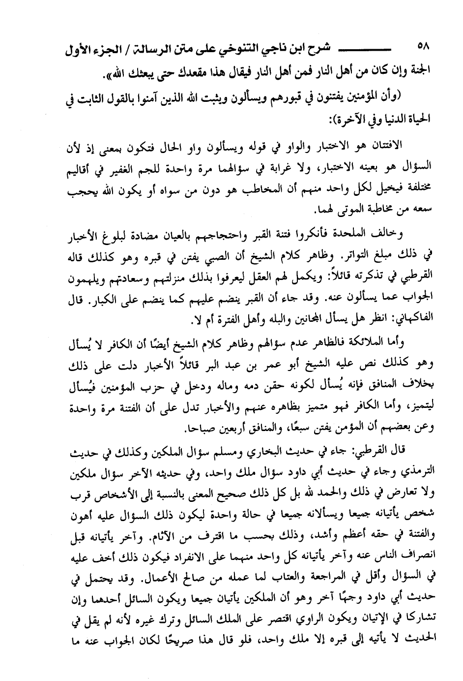 وخالف الملحدة فأنكروا فتنة القبر واحتجاجهم بالعيان مضادة لبلوغ الأخبار في ذلك مبلغ التواتر. وظاهر كلام الشيخ أن الصبي يفتن في قبره وهو كذلك قاله القرطبي في تذكرته قائلا: ويكمل لهم العقل ليعرفوا بذلك منزلتهم وسعادتهم ويلهمون الجواب عما يسألون عنه. وقد جاء أن القبر ينضم عليهم كم ينضم على الكبار. قال الفاكهاني: انظر هل يسأل المجانين والبله وأهل الفترة أم لا.