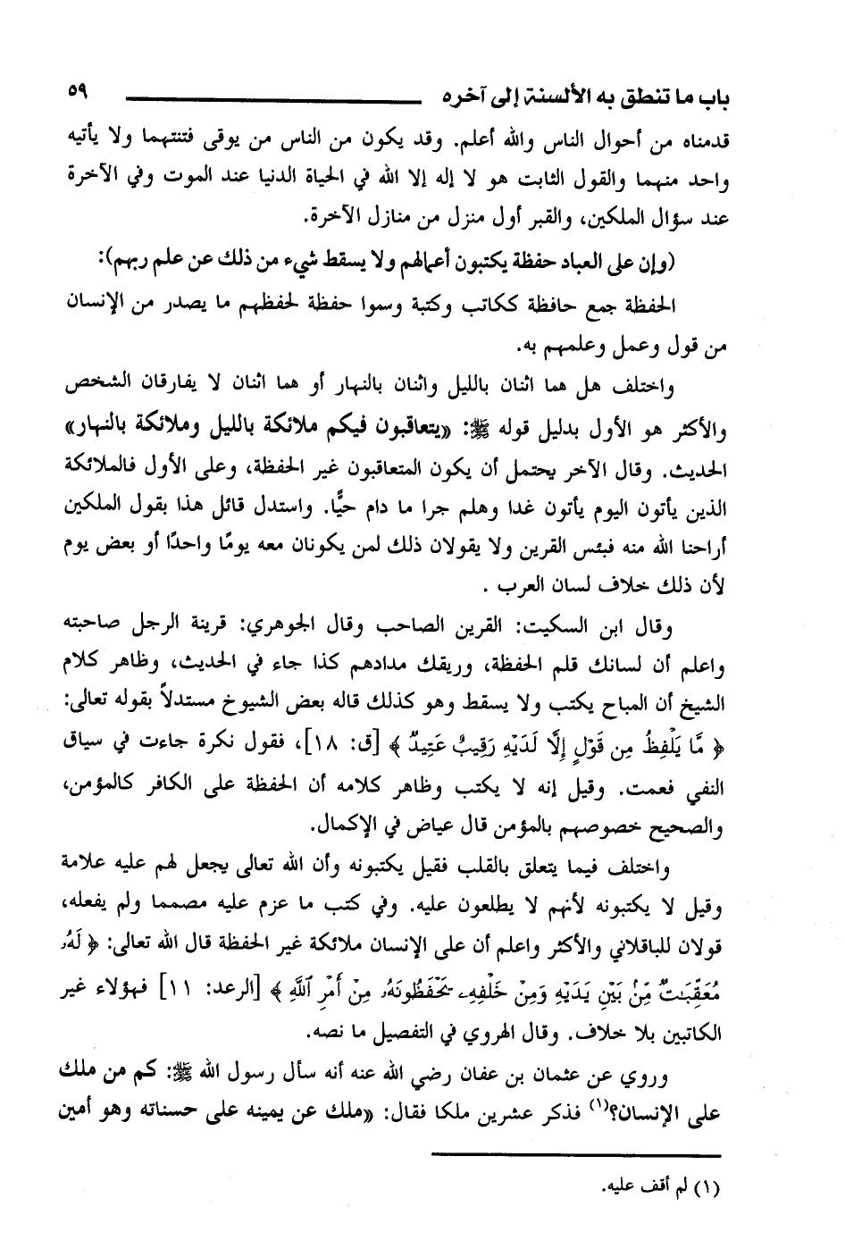 واختلف هل هما اثنان بالليل واثنان بالنهار أو هما اثنان لا يفارقان الشخص والأكثر هو الأول بدليل قوله صلى الله عليه وسلم: "يتعاقبون فيكم ملائكة بالليل وملائكة بالنهار" الحديث. وقال الآخر يحتمل أن يكون المتعاقبون غير الحفظة، وعلى الأول فالملائكة الذين يأتون اليوم غدا وهلم جرا مادام حيا. واستدل قائل هذا بقول الملكين أراحنا الله منه فبئس القرين ولا يقولان ذلك لمن يكونان معه يوما واحدا أو بعض يوم لأن ذلك خلاف لسان العرب.