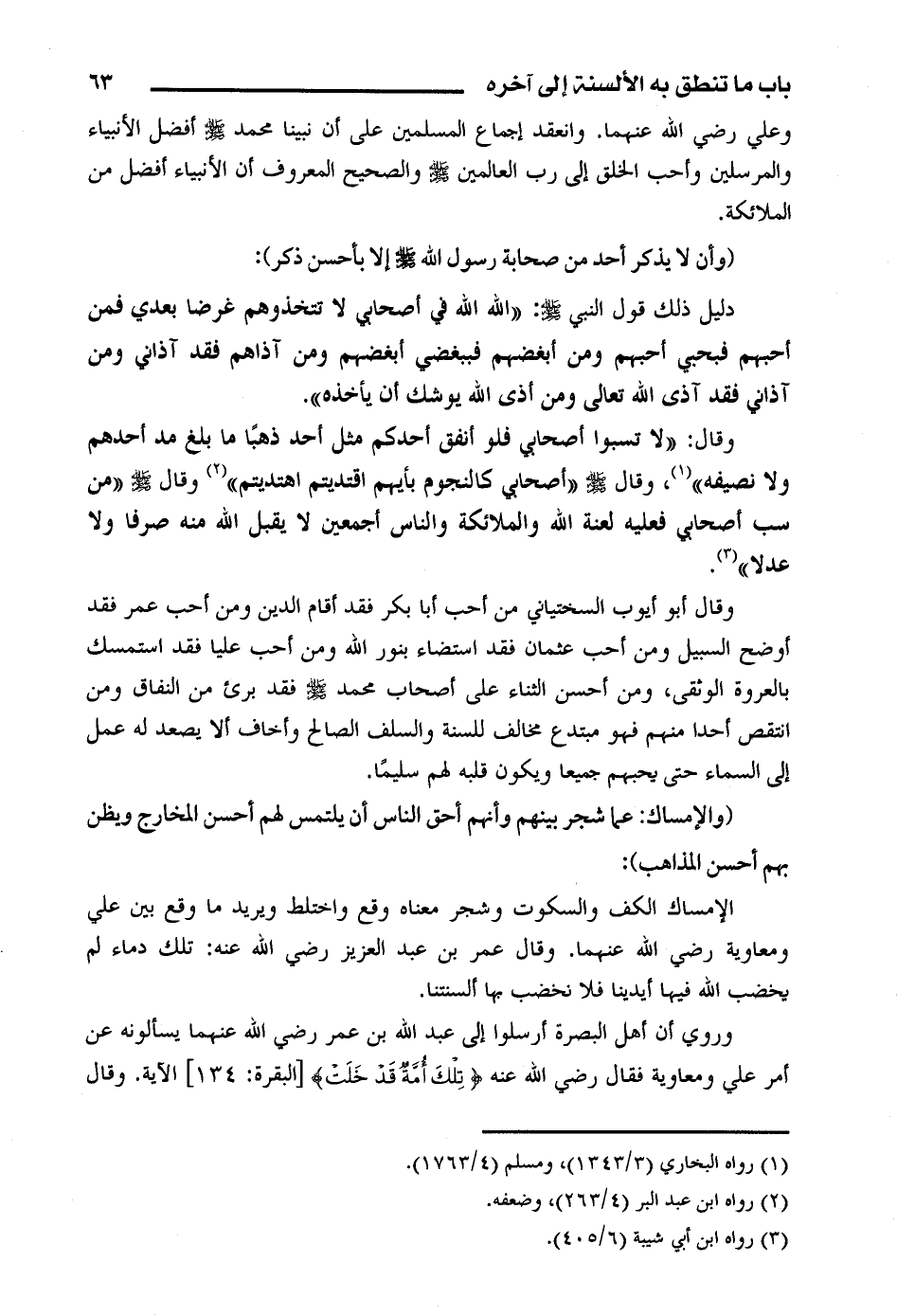 وقال: "لا تسبوا أصحابي فلو أنفق أحدكم مثل أحد ذهبا ما بلغ مد أحدهم ولا نصيفه"، وقال صلى الله عليه وسلم "أصحابي كالنجوم بأيهم اقتديتم اهتديتم" وقال صلى الله عليه وسلم "من سب أصحابي فعليه لعنة الله والملائكة والناس أجمعين لا يقبل الله منه صرفا ولا عدلا".