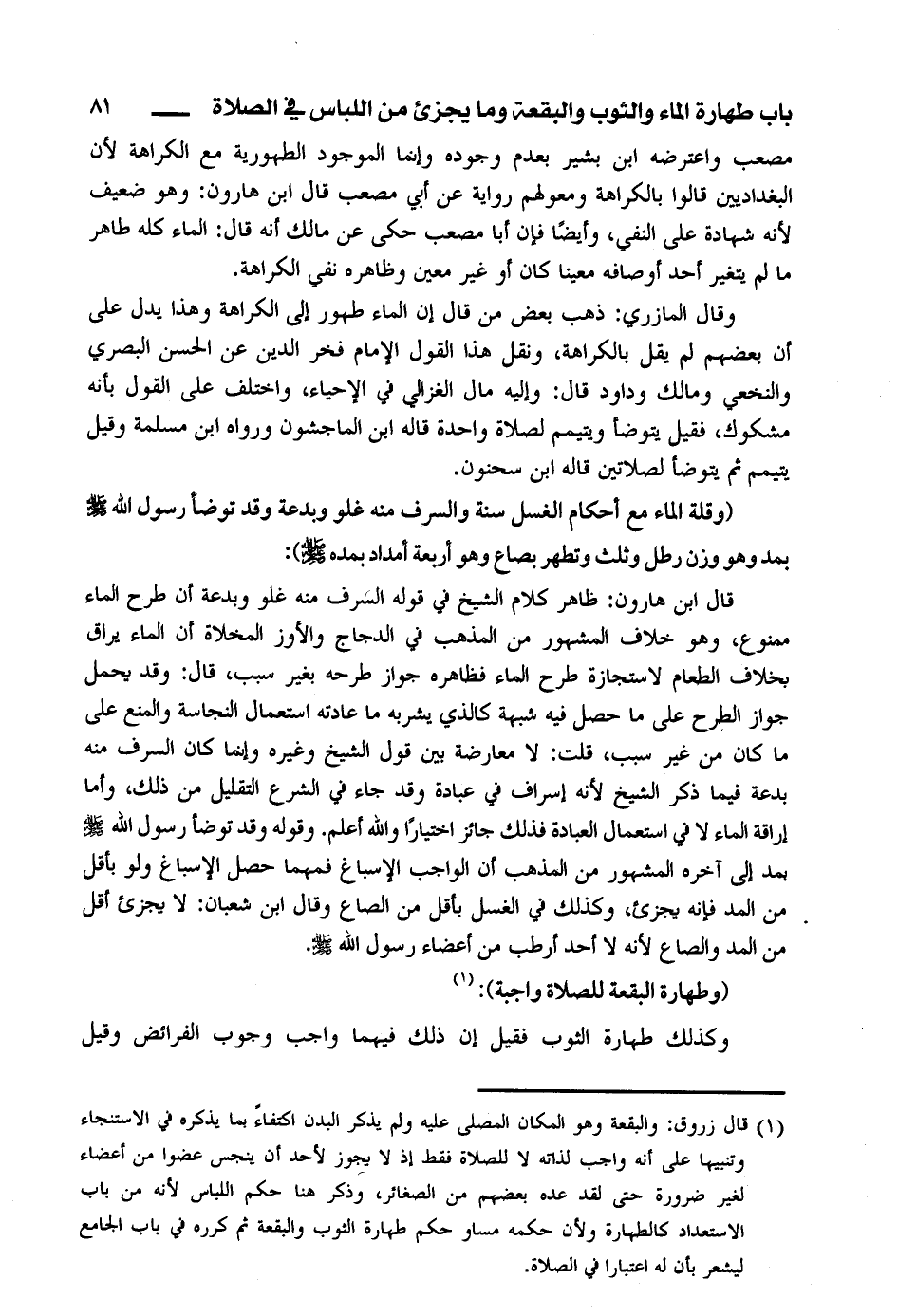 قال ابن هارون: ظاهر كلام الشيخ في قوله السرف منه غلو وبدعة أن طرح الماء ممنوع، وهو خلاف المشهور من المذهب في الدجاج والأوز المخلاة أن الماء يراق بخلاف الطعام لاستجازة طرح الماء فظاهره جواز طرحه بغير سبب، قال: وقد يحمل جواز الطرح على ما حصل فيه شبهة كلاذي يشربه ما عادته استعمال النجاسة والمنع على ما كان من غيرسبب، قلت: لا معارضة بين قول الشيخ وغيره وإنما كان السرف منه بدعة فيما ذكر الشيخ لأنه إسراف في عبادة وقد جاء في الشرع التقليل من ذلك، وأما إراقة الماء لا في استعمال العبادة فذلك جائز اختيارا والله أعلم. وقوله وقد توضأ صلى الله عليه وسلم بمد إلى آخره المشهور من المذهب أن الواجب الإسباغ فمهما حصل الإسباغ ولو بأقل من المد فإنه يجزئ، وكذلك في الغسل بأقل من الصاع وقال ابن شعبان: لا يجزئ أقل من المد والصاع لأنه لا أحد أرطب من أعضاء رسول الله صلى الله عليه وسلم: