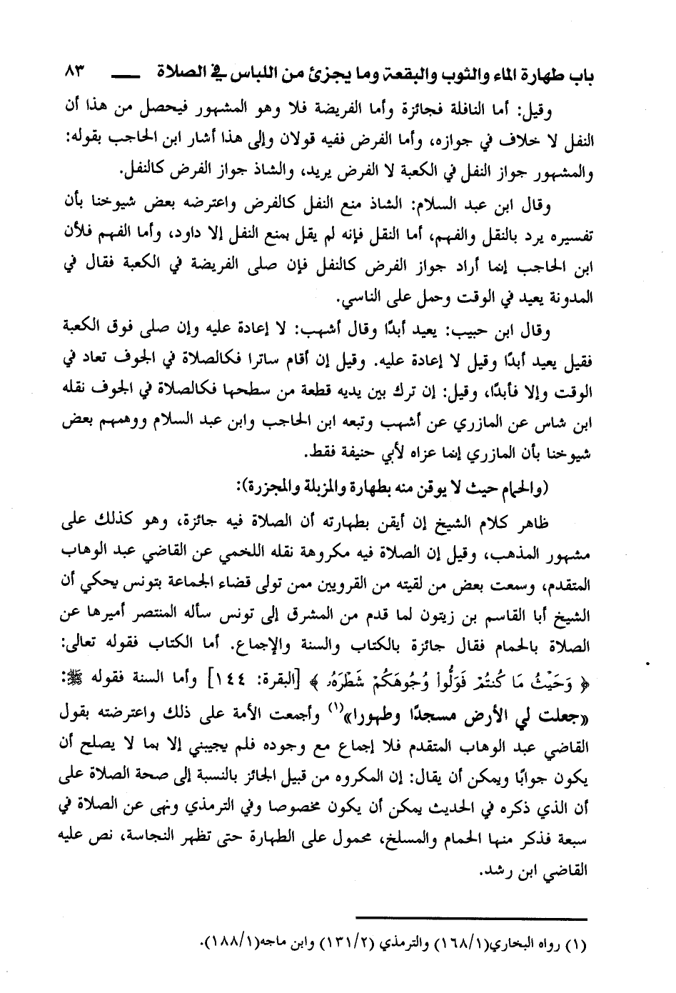 وأما السنة فقوله صلى الله عليه وسلم: "جعلت لي الأرض مسجدا وطهورا" وأجمعت الأمة على ذلك واعترضته بقول القاضي عبد الوهاب المتقدم فلا إجماع مع وجوده فلم يجيبني إلا بما لا يصلح أن يكون جوابا ويمكن أن يقال: إن المكروه من قبيل الجائز بالنسبة إلى صحة الصلاة على أن الذي ذكره في الحديث يمكن أن يكون مخصوصا وفي الترمذي ونهى عن الصلاة في سبعة فذكر منها الحمام والمسلخ، محمول على الطهارة حتى تظهر النجاسة، نص عليه القاضي ابن رشد.