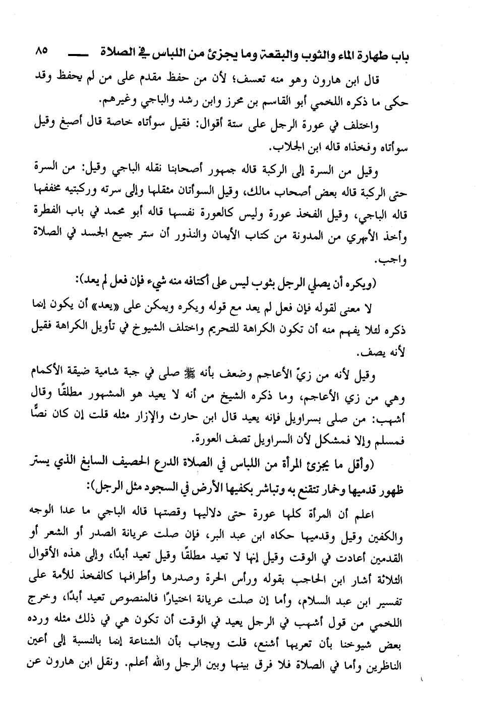 وقيل في السرة إلى الركبة قاله جمهور أصحابنا نقله الباجي وقيل: من السرة حتى الركبة قاله بعض أصحاب مالك، وقيل السوأتان مثقلها وإلى سرته وركبتيه مخففها قاله الباجي، وقيل الفخذ عورة وليس كالعورة نفسها قاله أبو محمد في باب الفطرة وأخذ الأبهري من المدونة من كتاب الأيمان والنذور أن ستر جميع الجسد في الصلاة واجب.