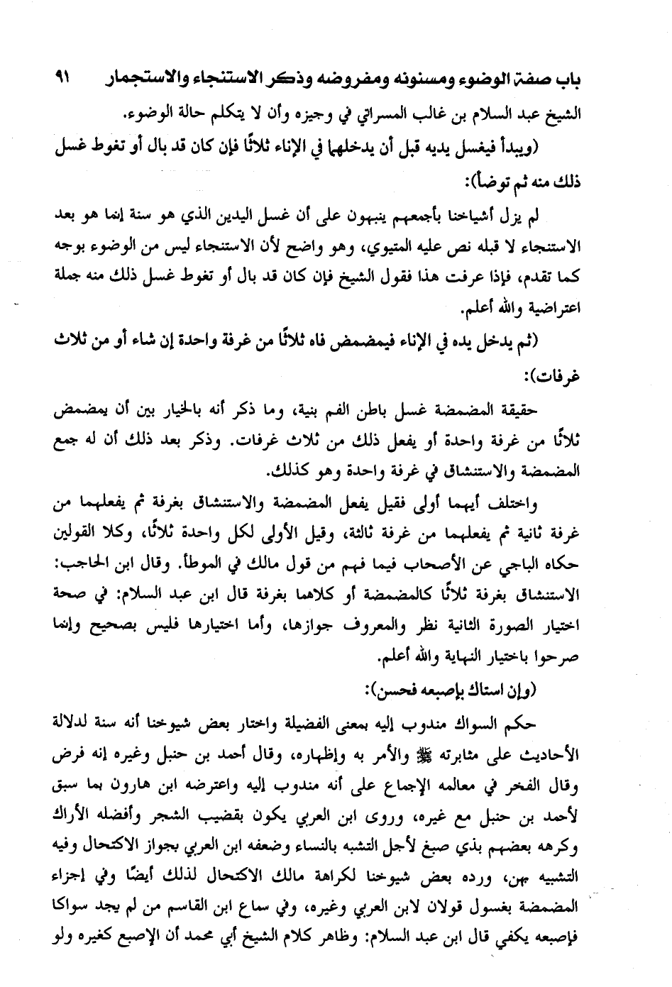 الشيخ عبدالسلام بن غالب المسراتي في وجيزه وأن لا يتكلم حالة الوضوء. (ويبدأ فيغسل يديه قبل أن يدخلهما في الإناء ثلاثا فإن كان قد بال أن تغوط غسل ذلك منه ثم توضأ):