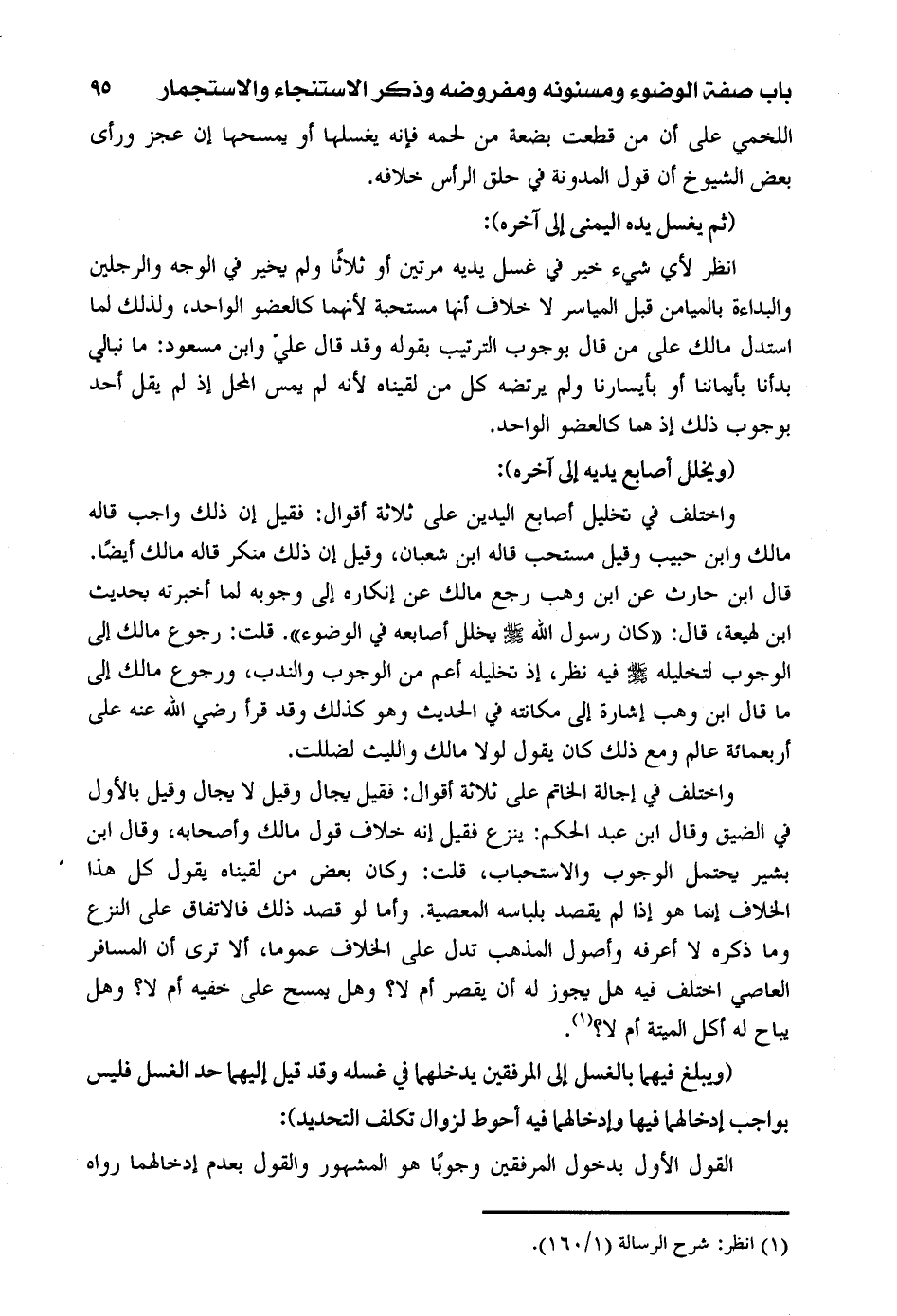 قال ابن الحارث عن ابن وهب رجع ابن مالك من إنكاره إلى وجوبه لما أخبرت بحديث ابن لهيعة، قال: "كان رسول الله صلى الله عليه وسلم يخلل أصابعه في الوضوء". قلت: رجوع مالك إلى الوجوب لتخليله صلى الله عليه وسلم فيه نظر، إذ تخليله أعم عن الوجوب والندب، ورجوع مالك إلى ما قال ابن وهب إشارة إلى مكانته في الحديث وهو كذلك وقد قرأ رضي الله عنه على أربعمائة عالم ومع ذلك كان يقول لولا مالك والليث لضللت.