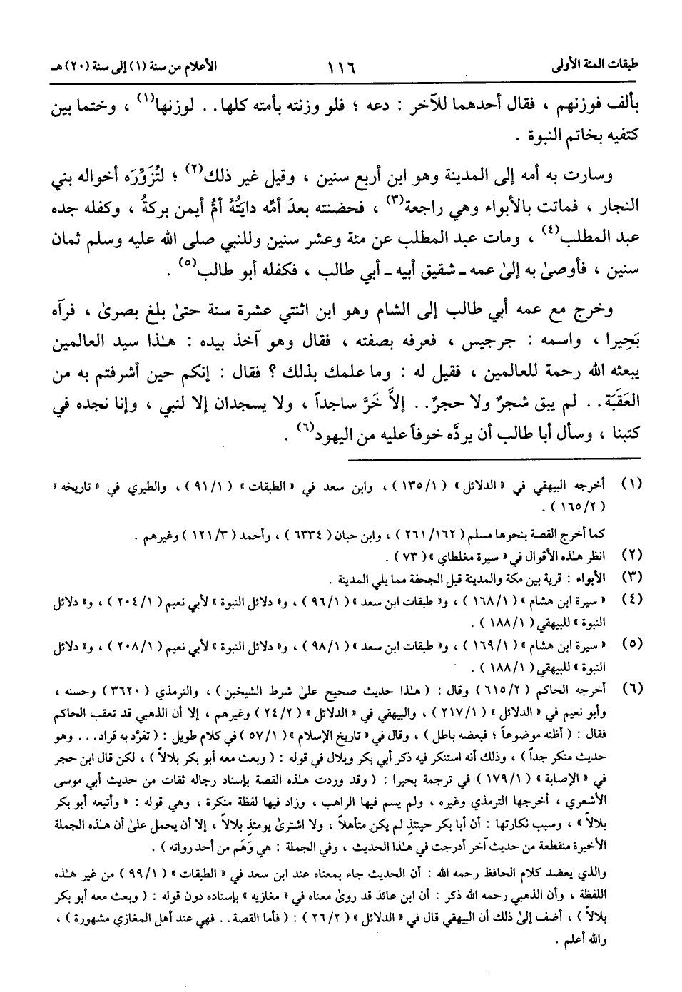 (6) أخرجه الحاكم (2/ 615) وقال: (هذا حديث صحيح على شرط الشيخين)، والترمذي (3620) وحسنه، وأبو نعيم في «الدلائل» (1/ 217)، والبيهقي في «الدلائل» (2/ 24) وغيرهم، إلا أن الذهبي قد تعقب الحاكم فقال: (أظنه موضوعا؛ فبعضه باطل)، وقال في «تاريخ الإسلام» (1/ 57) في كلام طويل: (تفرّد به قراد ... وهو حديث منكر جدا)، وذلك أنه استنكر فيه ذكر أبي بكر وبلال في قوله: (وبعث معه أبو بكر بلالا)، لكن قال ابن حجر في «الإصابة» (1/ 179) في ترجمة بحيرا: (وقد وردت هذه القصة بإسناد رجاله ثقات من حديث أبي موسى الأشعري، أخرجها الترمذي وغيره، ولم يسم فيها الراهب، وزاد فيها لفظة منكرة، وهي قوله: «وأتبعه أبو بكر بلالا»، وسبب نكارتها: أن أبا بكر حينئذ لم يكن متأهلا، ولا اشترى يومئذ بلالا، إلا أن يحمل على أن هذه الجملة الأخيرة منقطعة من حديث آخر أدرجت في هذا الحديث، وفي الجملة: هي وهم من أحد رواته). والذي يعضد كلام الحافظ رحمه الله: أن الحديث جاء بمعناه عند ابن سعد في «الطبقات» (1/ 99) من غير هذه اللفظة، وأن الذهبي رحمه الله ذكر: أن ابن عائذ قد روى معناه في «مغازيه» بإسناده دون قوله: (وبعث معه أبو بكر بلالا)، أضف إلى ذلك أن البيهقي قال في «الدلائل» (2/ 26): (فأما القصة .. فهي عند أهل المغازي مشهورة)، والله أعلم.