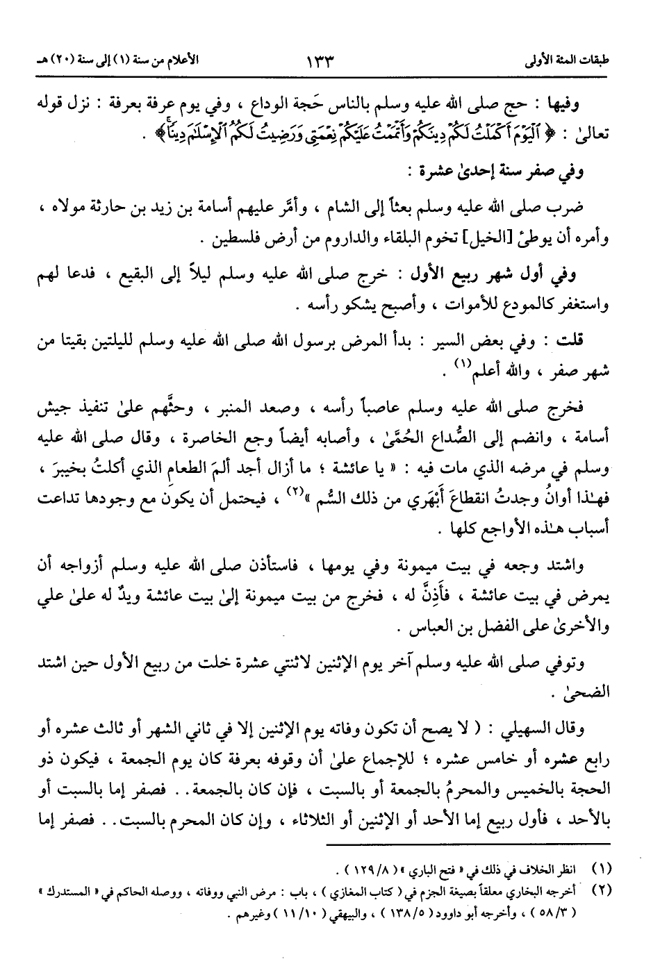 وقال السهيلي: (لا يصح أن تكون وفاته يوم الاثنين إلا في ثاني الشهر أو ثالث عشره أو رابع عشره أو خامس عشره؛ للإجماع على أن وقوفه بعرفة كان يوم الجمعة، فيكون ذو الحجة بالخميس والمحرم بالجمعة أو بالسبت، فإن كان بالجمعة .. فصفر إما بالسبت أو بالأحد، فأول ربيع إما الأحد أو الاثنين أو الثلاثاء، وإن كان المحرم بالسبت .. فصفر إما