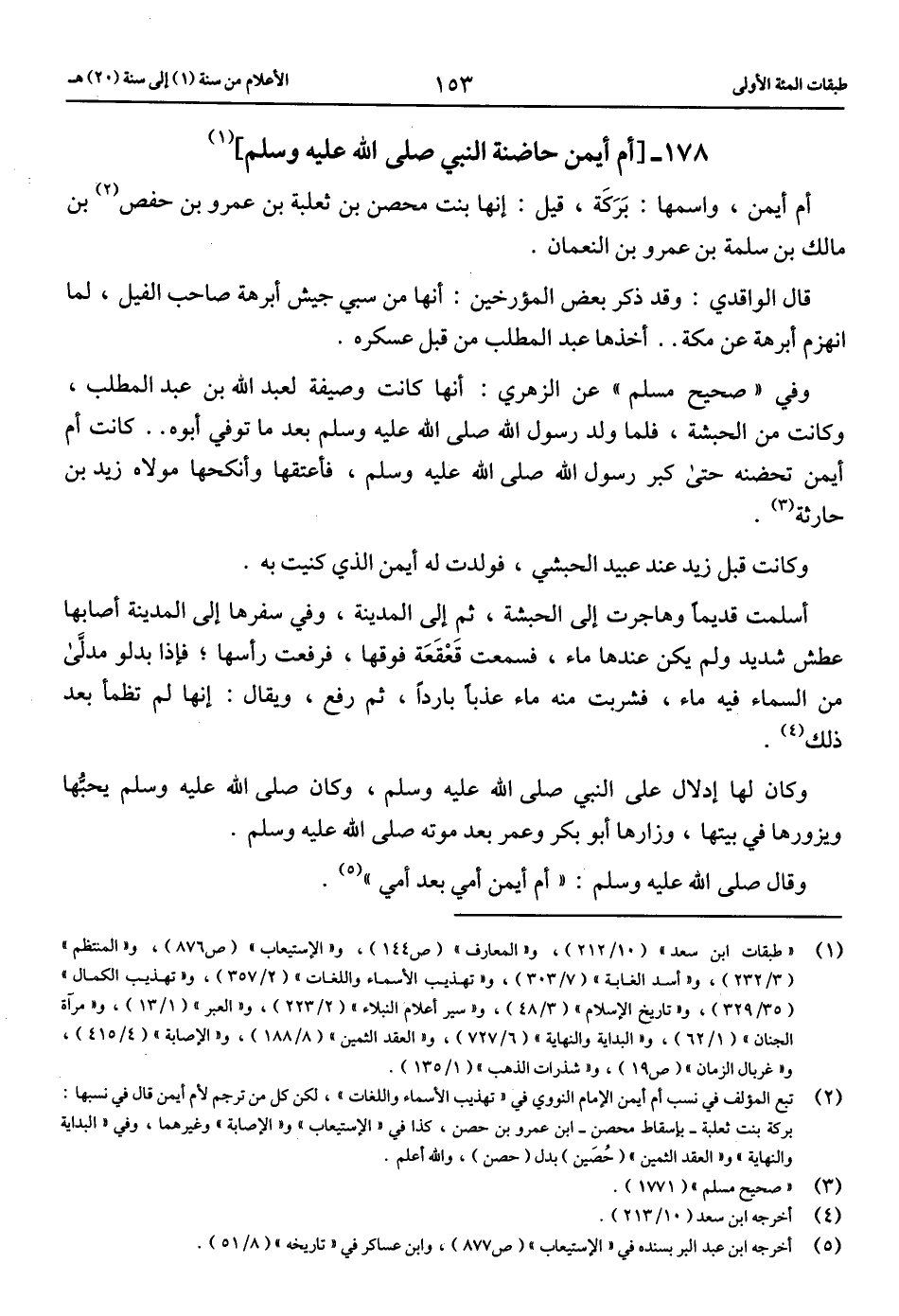 (2) تبع المؤلف في نسب أم أيمن الإمام النووي في «تهذيب الأسماء واللغات»، لكن كل من ترجم لأم أيمن قال في نسبها: بركة بنت ثعلبة-بإسقاط محصن-ابن عمرو بن حصن، كذا في «الاستيعاب» و «الإصابة» وغيرهما، وفي «البداية والنهاية» و «العقد الثمين» (حصين) بدل (حصن)، والله أعلم.