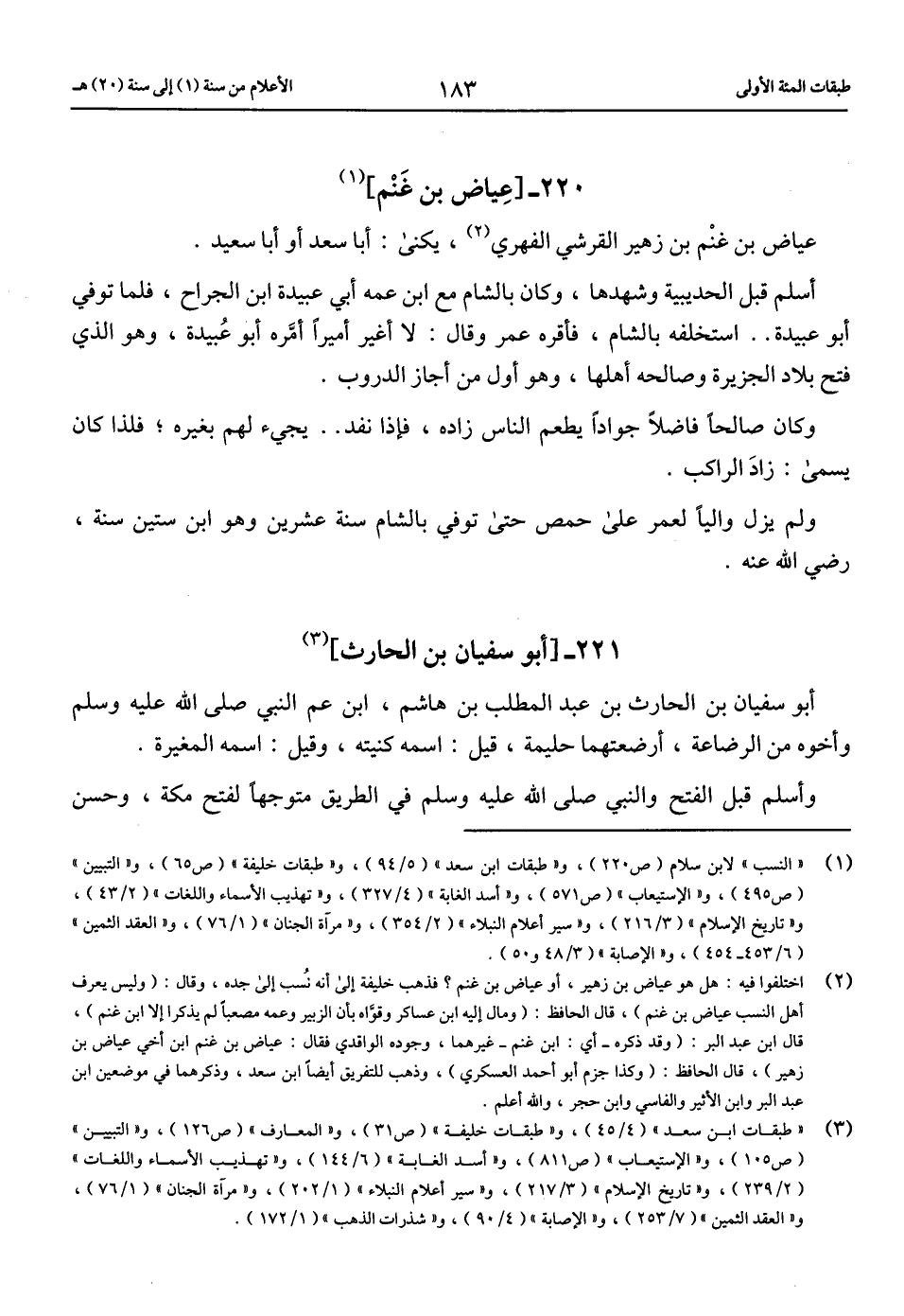 (1) «النسب» لابن سلام (ص 220)، و «طبقات ابن سعد» (5/ 94)، و «طبقات خليفة» (ص 65)، و «التبيين» (ص 495)، و «الاستيعاب» (ص 571)، و «أسد الغابة» (4/ 327)، و «تهذيب الأسماء واللغات» (2/ 43)، و «تاريخ الإسلام» (3/ 216)، و «سير أعلام النبلاء» (2/ 354)، و «مرآة الجنان» (1/ 76)، و «العقد الثمين» (453/ 6 - 454)، و «الإصابة» (48/ 3 و 50).