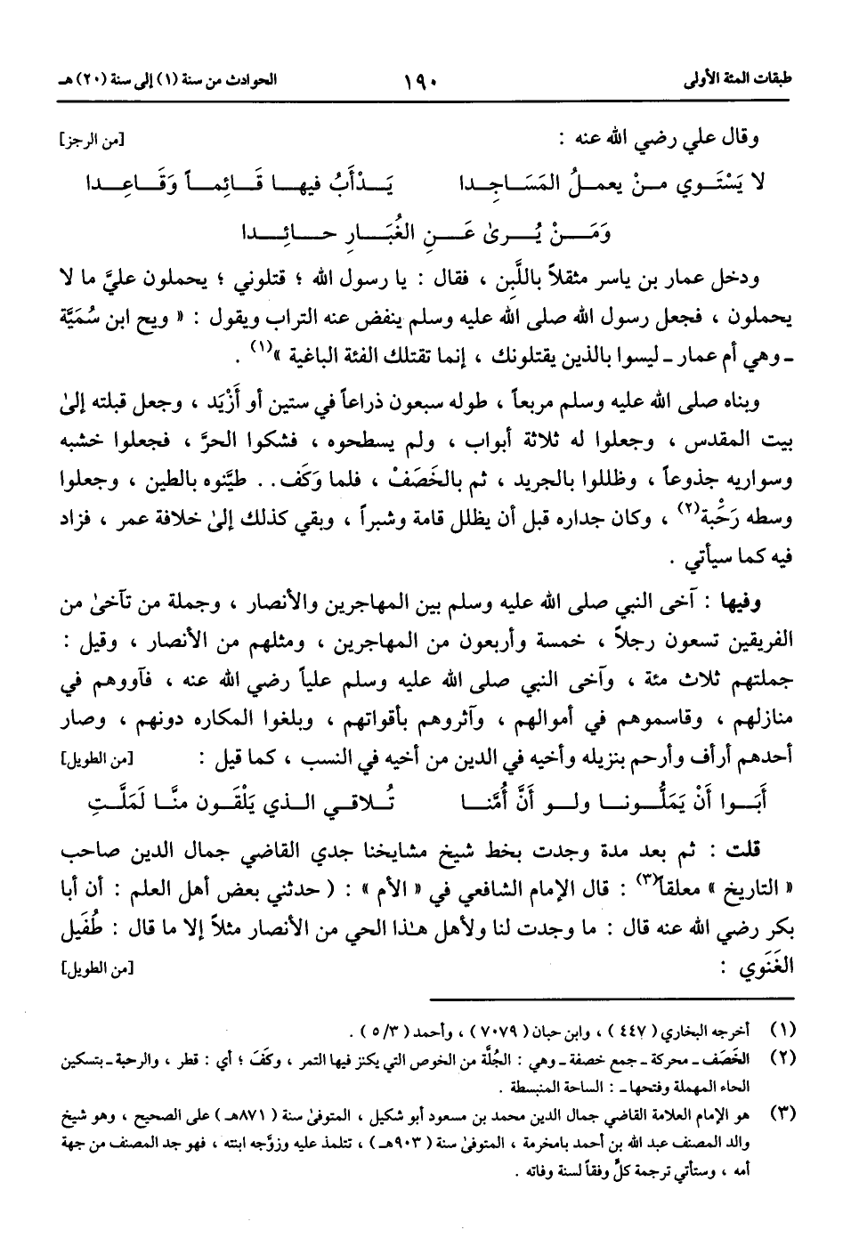 قلت: ثم بعد مدة وجدت بخط شيخ مشايخنا جدي القاضي جمال الدين صاحب «التاريخ» معلقا (3): قال الإمام الشافعي في «الأم»: (حدثني بعض أهل العلم: أن أبا بكر رضي الله عنه قال: ما وجدت لنا ولأهل هذا الحي من الأنصار مثلا إلا ما قال: طفيل الغنوي: [من الطويل]