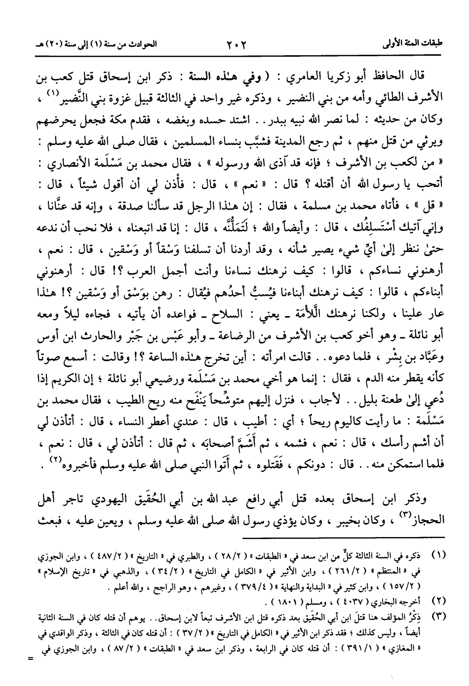 قال الحافظ أبو زكريا العامري: (وفي هذه السنة: ذكر ابن إسحاق قتل كعب بن الأشرف الطائي وأمه من بني النضير، وذكره غير واحد في الثالثة قبيل غزوة بني النّضير (1)، وكان من حديثه: لما نصر الله نبيه ببدر .. اشتد حسده وبغضه، فقدم مكة فجعل يحرضهم ويرثي من قتل منهم، ثم رجع المدينة فشبّب بنساء المسلمين، فقال صلّى الله عليه وسلم: