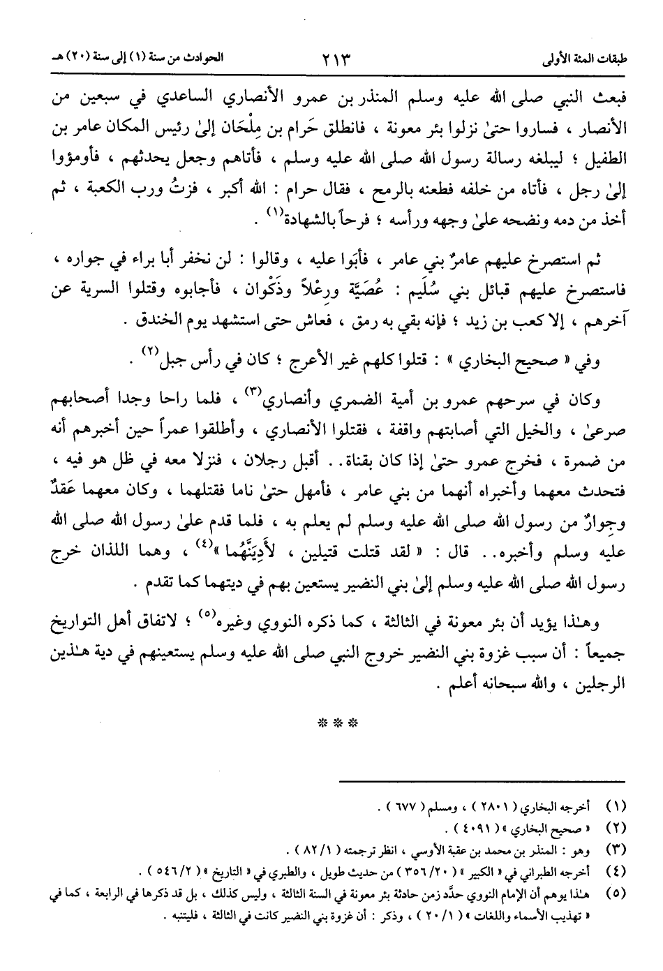 (5) هذا يوهم أن الإمام النووي حدّد زمن حادثة بئر معونة في السنة الثالثة، وليس كذلك، بل قد ذكرها في الرابعة، كما في «تهذيب الأسماء واللغات» (1/ 20)، وذكر: أن غزوة بني النضير كانت في الثالثة، فليتنبه.