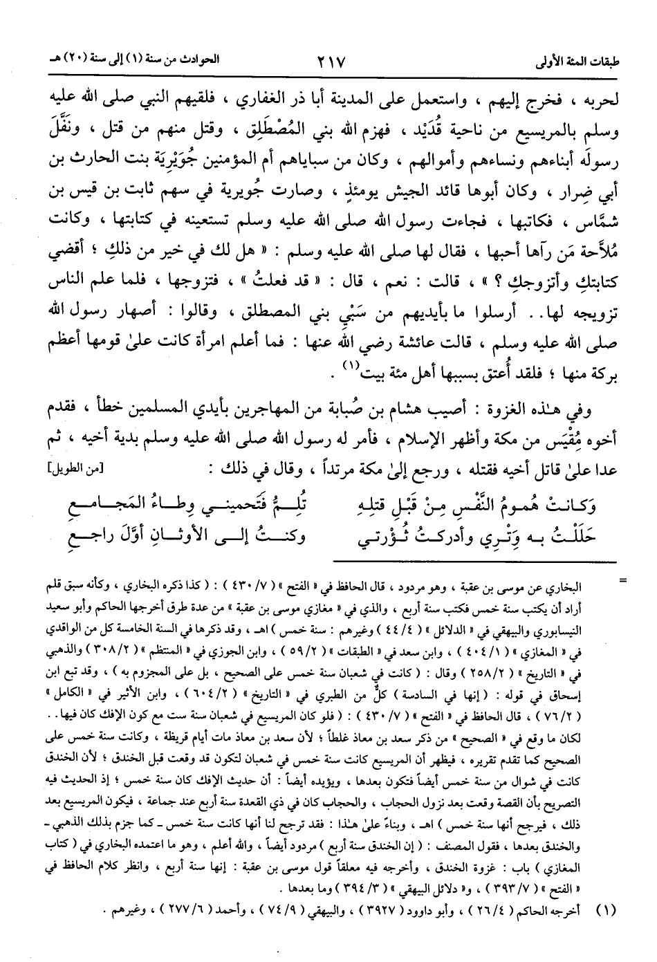 = البخاري عن موسى بن عقبة، وهو مردود، قال الحافظ في «الفتح» (7/ 430): (كذا ذكره البخاري، وكأنه سبق قلم أراد أن يكتب سنة خمس فكتب سنة أربع، والذي في «مغازي موسى بن عقبة» من عدة طرق أخرجها الحاكم وأبو سعيد النيسابوري والبيهقي في «الدلائل» (4/ 44) وغيرهم: سنة خمس) اهـ، وقد ذكرها في السنة الخامسة كل من الواقدي في «المغازي» (1/ 404)، وابن سعد في «الطبقات» (2/ 59)، وابن الجوزي في «المنتظم» (2/ 308) والذهبي في «التاريخ» (2/ 258) وقال: (كانت في شعبان سنة خمس على الصحيح، بل على المجزوم به)، وقد تبع ابن إسحاق في قوله: (إنها في السادسة) كلّ من الطبري في «التاريخ» (2/ 604)، وابن الأثير في «الكامل» (2/ 76)، قال الحافظ في «الفتح» (7/ 430): (فلو كان المريسيع في شعبان سنة ست مع كون الإفك كان فيها .. لكان ما وقع في «الصحيح» من ذكر سعد بن معاذ غلطا؛ لأن سعد بن معاذ مات أيام قريظة، وكانت سنة خمس على الصحيح كما تقدم تقريره، فيظهر أن المريسيع كانت سنة خمس في شعبان لتكون قد وقعت قبل الخندق؛ لأن الخندق كانت في شوال من سنة خمس أيضا فتكون بعدها، ويؤيده أيضا: أن حديث الإفك كان سنة خمس؛ إذ الحديث فيه التصريح بأن القصة وقعت بعد نزول الحجاب، والحجاب كان في ذي القعدة سنة أربع عند جماعة، فيكون المريسيع بعد ذلك، فيرجح أنها سنة خمس) اهـ، وبناء على هذا: فقد ترجح لنا أنها كانت سنة خمس-كما جزم بذلك الذهبي- والخندق بعدها، فقول المصنف: (إن الخندق سنة أربع) مردود أيضا، والله أعلم، وهو ما اعتمده البخاري في (كتاب المغازي) باب: غزوة الخندق، وأخرجه فيه معلقا قول موسى بن عقبة: إنها سنة أربع، وانظر كلام الحافظ في «الفتح» (7/ 393)، و «دلائل البيهقي» (3/ 394) وما بعدها.