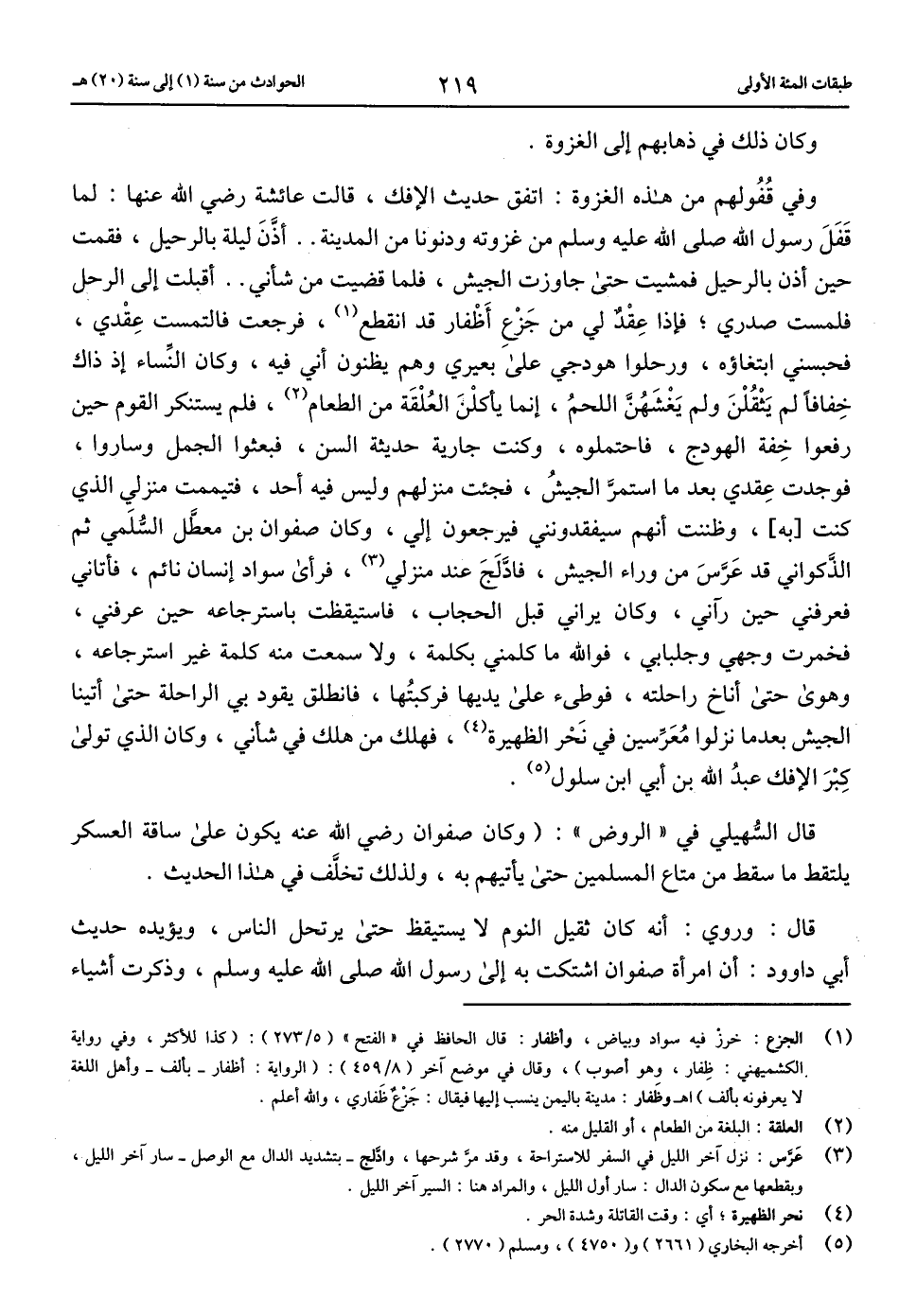 وفي قفولهم من هذه الغزوة: اتفق حديث الإفك، قالت عائشة رضي الله عنها: لما قفل رسول الله صلّى الله عليه وسلم من غزوته ودنونا من المدينة .. أذّن ليلة بالرحيل، فقمت حين أذن بالرحيل فمشيت حتى جاوزت الجيش، فلما قضيت من شأني .. أقبلت إلى الرحل فلمست صدري؛ فإذا عقد لي من جزع أظفار قد انقطع (1)، فرجعت فالتمست عقدي، فحبسني ابتغاؤه، ورحلوا هودجي على بعيري وهم يظنون أني فيه، وكان النّساء إذ ذاك خفافا لم يثقلن ولم يغشهنّ اللحم، إنما يأكلن العلقة من الطعام (2)، فلم يستنكر القوم حين رفعوا خفة الهودج، فاحتملوه، وكنت جارية حديثة السن، فبعثوا الجمل وساروا، فوجدت عقدي بعد ما استمرّ الجيش، فجئت منزلهم وليس فيه أحد، فتيممت منزلي الذي كنت [به]، وظننت أنهم سيفقدونني فيرجعون إلي، وكان صفوان بن معطّل السّلمي ثم الذّكواني قد عرّس من وراء الجيش، فادّلج عند منزلي (3)، فرأى سواد إنسان نائم، فأتاني فعرفني حين رآني، وكان يراني قبل الحجاب، فاستيقظت باسترجاعه حين عرفني، فخمرت وجهي وجلبابي، فو الله ما كلمني بكلمة، ولا سمعت منه كلمة غير استرجاعه، وهوى حتى أناخ راحلته، فوطئ على يديها فركبتها، فانطلق يقود بي الراحلة حتى أتينا الجيش بعد ما نزلوا معرّسين في نحر الظهيرة (4)، فهلك من هلك في شأني، وكان الذي تولى كبر الإفك عبد الله بن أبي ابن سلول (5).