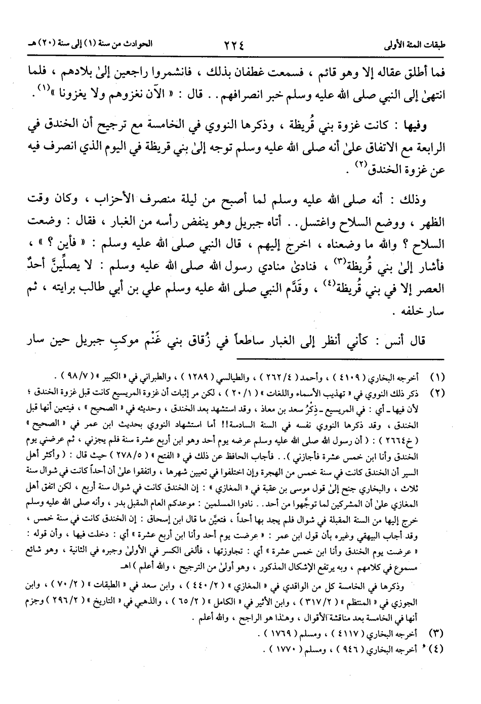 (2) ذكر ذلك النووي في «تهذيب الأسماء واللغات» (1/ 20)، لكن مر إثبات أن غزوة المريسيع كانت قبل غزوة الخندق؛ لأن فيها-أي: في المريسيع-ذكر سعد بن معاذ، وقد استشهد بعد الخندق، وحديثه في «الصحيح»، فيتعين أنها قبل الخندق، وقد ذكرها النووي نفسه في السنة السادسة! ! أما استشهاد النووي بحديث ابن عمر في «الصحيح» (خ 2664): (أن رسول الله صلّى الله عليه وسلم عرضه يوم أحد وهو ابن أربع عشرة سنة فلم يجزني، ثم عرضني يوم الخندق وأنا ابن خمس عشرة فأجازني) .. فأجاب الحافظ عن ذلك في «الفتح» (5/ 278) حيث قال: (وأكثر أهل السير أن الخندق كانت في سنة خمس من الهجرة وإن اختلفوا في تعيين شهرها، واتفقوا على أن أحدا كانت في شوال سنة ثلاث، والبخاري جنح إلى قول موسى بن عقبة في «المغازي»: إن الخندق كانت في شوال سنة أربع، لكن اتفق أهل المغازي على أن المشركين لما توجّهوا من أحد .. نادوا المسلمين: موعدكم العام المقبل بدر، وأنه صلّى الله عليه وسلم خرج إليها من السنة المقبلة في شوال فلم يجد بها أحدا، فتعيّن ما قال ابن إسحاق: إن الخندق كانت في سنة خمس، وقد أجاب البيهقي وغيره بأن قول ابن عمر: «عرضت يوم أحد وأنا ابن أربع عشرة» أي: دخلت فيها، وأن قوله: «عرضت يوم الخندق وأنا ابن خمس عشرة» أي: تجاوزتها، فألغى الكسر في الأولى وجبره في الثانية، وهو شائع مسموع في كلامهم، وبه يرتفع الإشكال المذكور، وهو أولى من الترجيح، والله أعلم) اهـ وذكرها في الخامسة كل من الواقدي في «المغازي» (2/ 440)، وابن سعد في «الطبقات» (2/ 70)، وابن الجوزي في «المنتظم» (2/ 317)، وابن الأثير في «الكامل» (2/ 65)، والذهبي في «التاريخ» (2/ 296) وجزم أنها في الخامسة بعد مناقشة الأقوال، وهذا هو الراجح، والله أعلم.