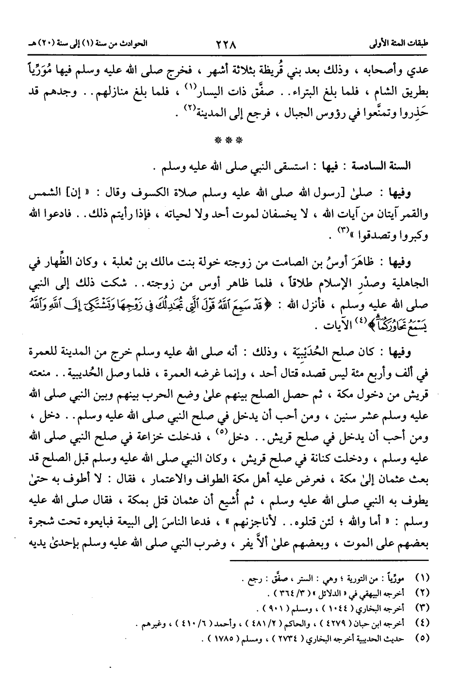 وفيها: كان صلح الحديبية، وذلك: أنه صلّى الله عليه وسلم خرج من المدينة للعمرة في ألف وأربع مائة ليس قصده قتال أحد، وإنما غرضه العمرة، فلما وصل الحديبية .. منعته قريش من دخول مكة، ثم حصل الصلح بينهم على وضع الحرب بينهم وبين النبي صلّى الله عليه وسلم عشر سنين، ومن أحب أن يدخل في صلح النبي صلّى الله عليه وسلم .. دخل، ومن أحب أن يدخل في صلح قريش .. دخل (5)، فدخلت خزاعة في صلح النبي صلّى الله عليه وسلم، ودخلت كنانة في صلح قريش، وكان النبي صلّى الله عليه وسلم قبل الصلح قد بعث عثمان إلى مكة، فعرض عليه أهل مكة الطواف والاعتمار، فقال: لا أطوف به حتى يطوف به النبي صلّى الله عليه وسلم، ثم أشيع أن عثمان قتل بمكة، فقال صلّى الله عليه وسلم: «أما والله؛ لئن قتلوه .. لأناجزنهم»، فدعا الناس إلى البيعة فبايعوه تحت شجرة بعضهم على الموت، وبعضهم على ألاّ يفر، وضرب النبي صلّى الله عليه وسلم بإحدى يديه