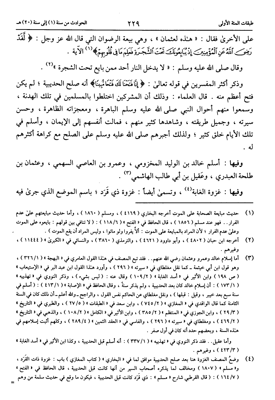 (3) أما إسلام خالد وعمرو وعثمان رضي الله عنهم .. فقد تبع المصنف في هذا القول العامري في «البهجة» (1/ 326)، وهو قول ابن أبي خيثمة-كما نقل مغلطاي في «سيرته» (296)، وأورد هذا القول ابن عبد البر في «الاستيعاب» (ص 198) وابن الأثير في «أسد الغابة» (2/ 109) وقال عنه: (ليس بشيء)، وذكر النووي في «تهذيبه» (1/ 173): أن إسلام خالد كان بعد الحديبية، ولم يذكر سنة، وقال الحافظ في «الإصابة» (1/ 413): (أسلم في سنة سبع بعد خيبر، وقيل: قبلها)، ونقل مغلطاي عن الحاكم نفس القول، والراجح-والله أعلم-أن ذلك كان في السنة الثامنة كما قال الواقدي في «المغازي» (2/ 745)، وابن سعد في «الطبقات» (5/ 27)، والطبري في «التاريخ» (3/ 29)، وابن الجوزي في «المنتظم» (2/ 385)، وابن الأثير في «الكامل» (2/ 108)، والذهبي في «التاريخ» (2/ 469)، ومغلطاي في «سيرته» (296)، والفاسي في «العقد الثمين» (4/ 289)، وكلهم أثبت إسلامهم في هذه السنة، وبعضهم حدد أنه كان في أول صفر. وأما عقيل .. فقد ذكر النووي في «تهذيبه» (1/ 337): أنه أسلم قبل الحديبية، وكذا ابن الأثير في «أسد الغابة» (3/ 423)، وغيرهم.