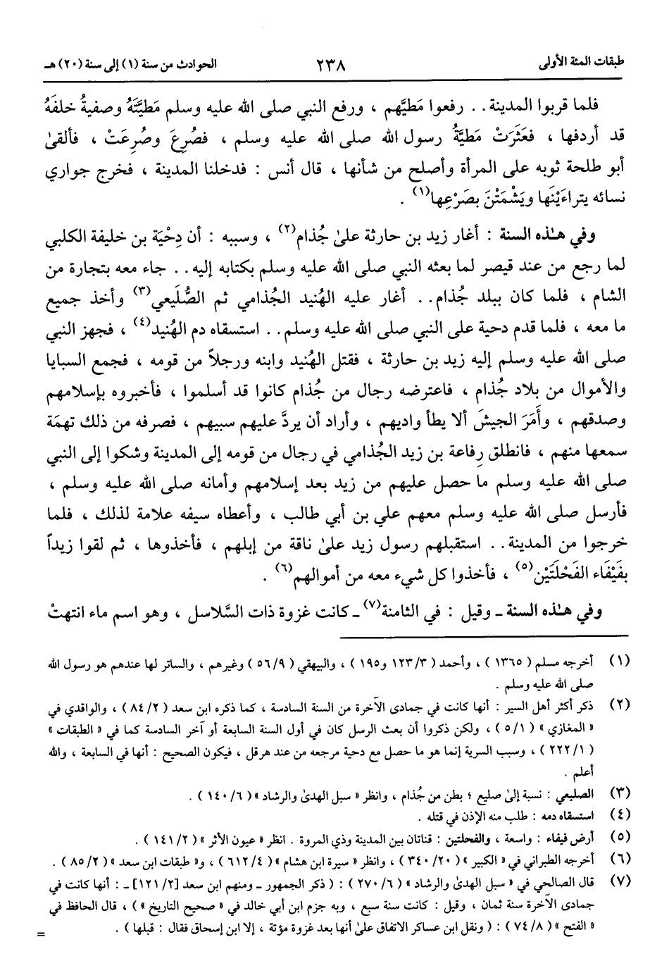 وفي هذه السنة: أغار زيد بن حارثة على جذام (2)، وسببه: أن دحية بن خليفة الكلبي لما رجع من عند قيصر لما بعثه النبي صلّى الله عليه وسلم بكتابه إليه .. جاء معه بتجارة من الشام، فلما كان ببلد جذام .. أغار عليه الهنيد الجذامي ثم الصّليعي (3) وأخذ جميع ما معه، فلما قدم دحية على النبي صلّى الله عليه وسلم .. استسقاه دم الهنيد (4)، فجهز النبي صلّى الله عليه وسلم إليه زيد بن حارثة، فقتل الهنيد وابنه ورجلا من قومه، فجمع السبايا والأموال من بلاد جذام، فاعترضه رجال من جذام كانوا قد أسلموا، فأخبروه بإسلامهم وصدقهم، وأمر الجيش ألا يطأ واديهم، وأراد أن يردّ عليهم سبيهم، فصرفه من ذلك تهمة سمعها منهم، فانطلق رفاعة بن زيد الجذامي في رجال من قومه إلى المدينة وشكوا إلى النبي صلّى الله عليه وسلم ما حصل عليهم من زيد بعد إسلامهم وأمانه صلّى الله عليه وسلم، فأرسل صلّى الله عليه وسلم معهم علي بن أبي طالب، وأعطاه سيفه علامة لذلك، فلما خرجوا من المدينة .. استقبلهم رسول زيد على ناقة من إبلهم، فأخذوها، ثم لقوا زيدا بفيفاء الفحلتين (5)، فأخذوا كل شيء معه من أموالهم (6).