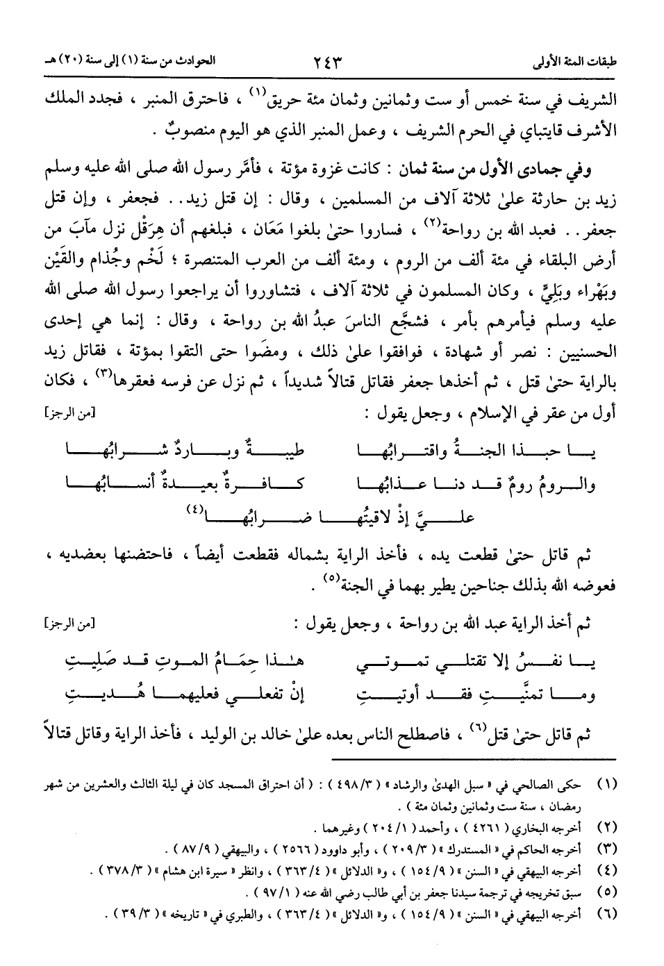 وفي جمادى الأول من سنة ثمان: كانت غزوة مؤتة، فأمّر رسول الله صلّى الله عليه وسلم زيد بن حارثة على ثلاثة آلاف من المسلمين، وقال: إن قتل زيد .. فجعفر، وإن قتل جعفر .. فعبد الله بن رواحة (2)، فساروا حتى بلغوا معان، فبلغهم أن هرقل نزل مآب من أرض البلقاء في مائة ألف من الروم، ومائة ألف من العرب المتنصرة؛ لخم وجذام والقين وبهراء وبليّ، وكان المسلمون في ثلاثة آلاف، فتشاوروا أن يراجعوا رسول الله صلّى الله عليه وسلم فيأمرهم بأمر، فشجّع الناس عبد الله بن رواحة، وقال: إنما هي إحدى الحسنيين: نصر أو شهادة، فوافقوا على ذلك، ومضوا حتى التقوا بمؤتة، فقاتل زيد بالراية حتى قتل، ثم أخذها جعفر فقاتل قتالا شديدا، ثم نزل عن فرسه فعقرها (3)، فكان أول من عقر في الإسلام، وجعل يقول: [من الرجز]