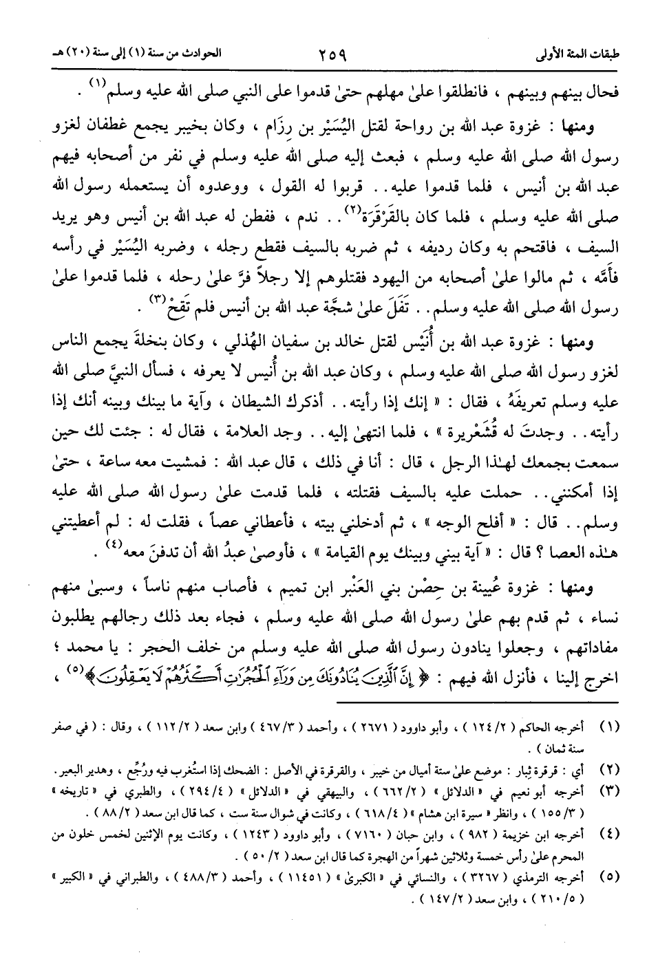 (3) أخرجه أبو نعيم في «الدلائل» (2/ 662)، والبيهقي في «الدلائل» (4/ 294)، والطبري في «تاريخه» (3/ 155)، وانظر «سيرة ابن هشام» (4/ 618)، وكانت في شوال سنة ست، كما قال ابن سعد (2/ 88).