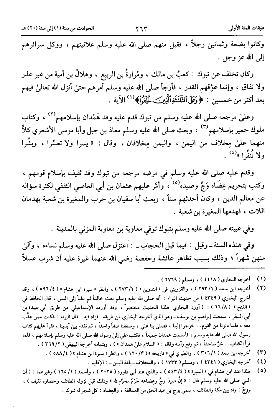 (2) أخرجه ابن سعد (1/ 293)، والقزويني في «التدوين» (2/ 273)، وانظر «سيرة ابن هشام» (4/ 596)، وقد أخرج البخاري (4349) من حديث البراء: أنه صلّى الله عليه وسلم بعث خالدا ثم عليا إلى اليمن، قال الحافظ في «الفتح» (8/ 66): (أورد البخاري هذا الحديث مختصرا، وقد أورده الإسماعيلي من طريق أبي عبيدة بن أبي السفر، سمعت إبراهيم بن يوسف-وهو الذي أخرجه البخاري من طريقه-فزاد فيه: قال البراء: فكنت ممن عقّب معه، فلما دنونا من القوم .. خرجوا إلينا، فصلى بنا علي، وصففنا صفا واحدا، ثم تقدم بين أيدينا، فقرأ عليهم كتاب رسول الله صلّى الله عليه وسلم، فأسلمت همدان جميعا، فكتب علي إلى رسول الله صلّى الله عليه وسلم بإسلامهم، فلما قرأ الكتاب .. خرّ ساجدا، ثم رفع رأسه وقال: «السلام على همدان»)، وبتمامه أخرجه البيهقي (2/ 369).
