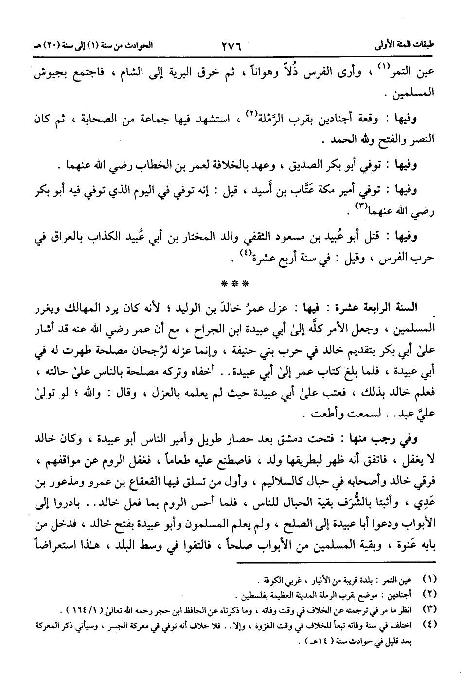 (4) اختلف في سنة وفاته تبعا للخلاف في وقت الغزوة، وإلا .. فلا خلاف أنه توفي في معركة الجسر، وسيأتي ذكر المعركة بعد قليل في حوادث سنة (14 هـ).