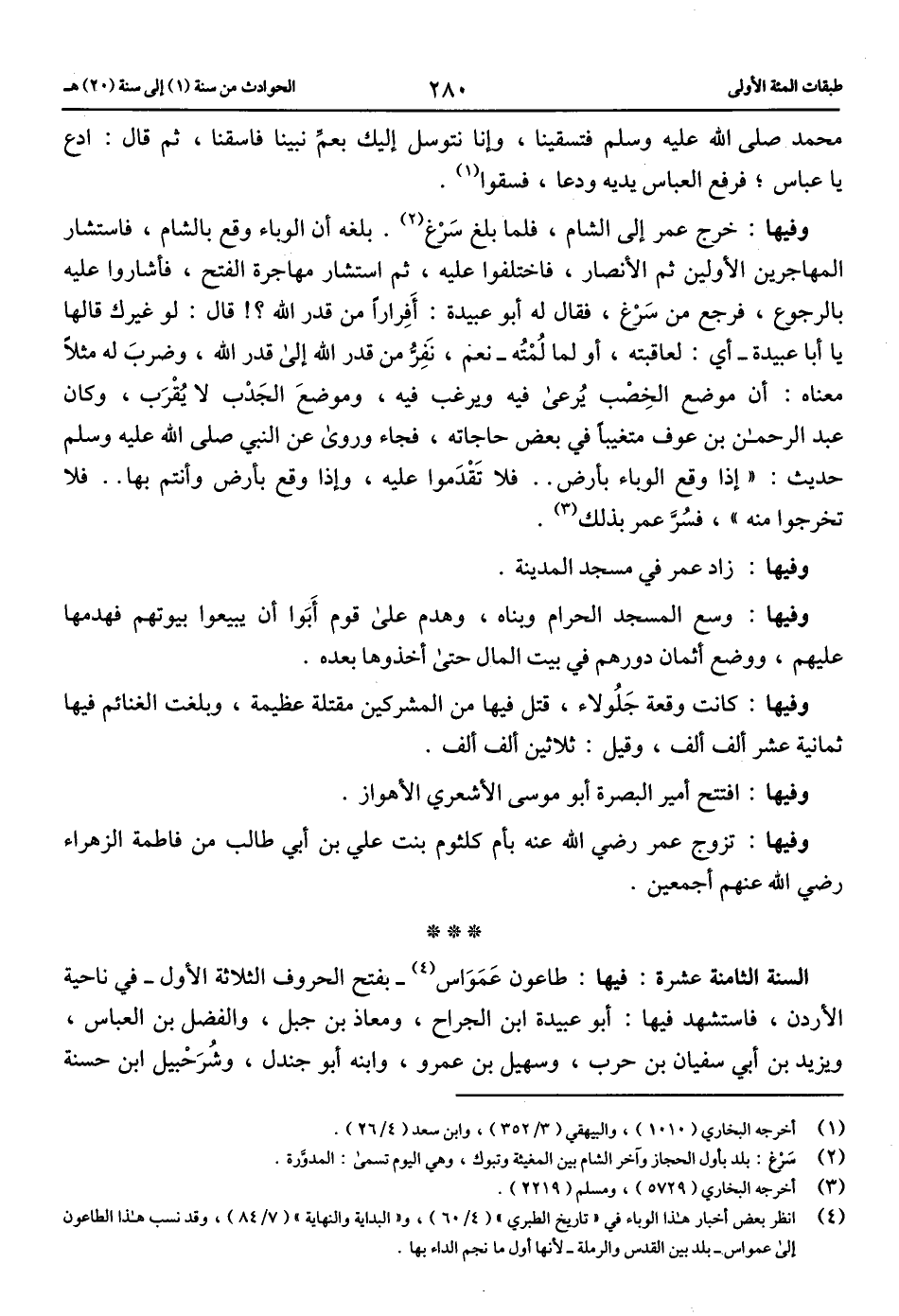 (4) انظر بعض أخبار هذا الوباء في «تاريخ الطبري» (4/ 60)، و «البداية والنهاية» (7/ 84)، وقد نسب هذا الطاعون إلى عمواس-بلد بين القدس والرملة-لأنها أول ما نجم الداء بها.