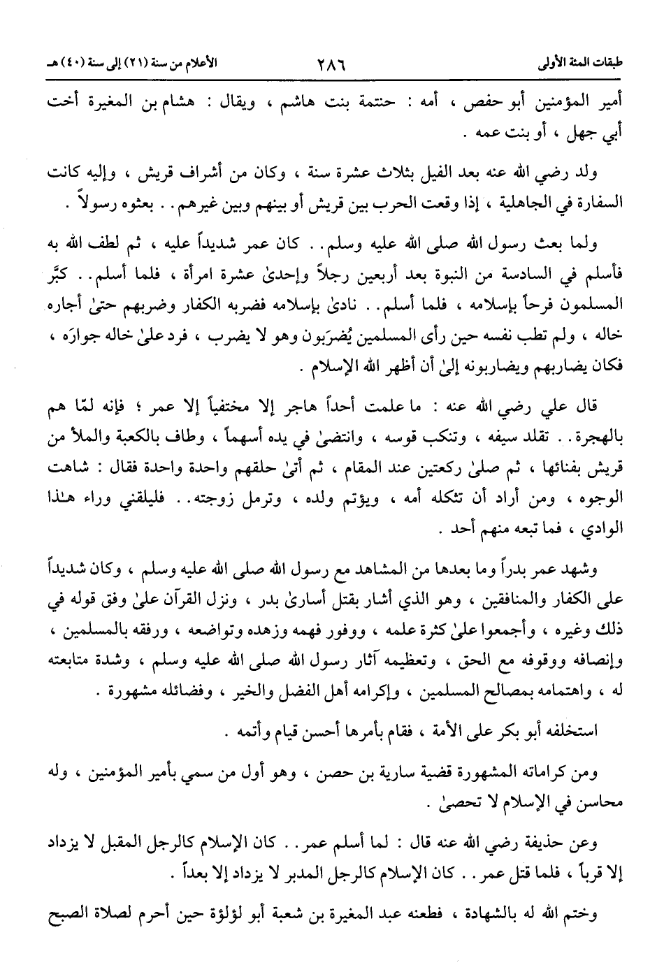 وشهد عمر بدرا وما بعدها من المشاهد مع رسول الله صلّى الله عليه وسلم، وكان شديدا على الكفار والمنافقين، وهو الذي أشار بقتل أسارى بدر، ونزل القرآن على وفق قوله في ذلك وغيره، وأجمعوا على كثرة علمه، ووفور فهمه وزهده وتواضعه، ورفقه بالمسلمين، وإنصافه ووقوفه مع الحق، وتعظيمه آثار رسول الله صلّى الله عليه وسلم، وشدة متابعته له، واهتمامه بمصالح المسلمين، وإكرامه أهل الفضل والخير، وفضائله مشهورة.