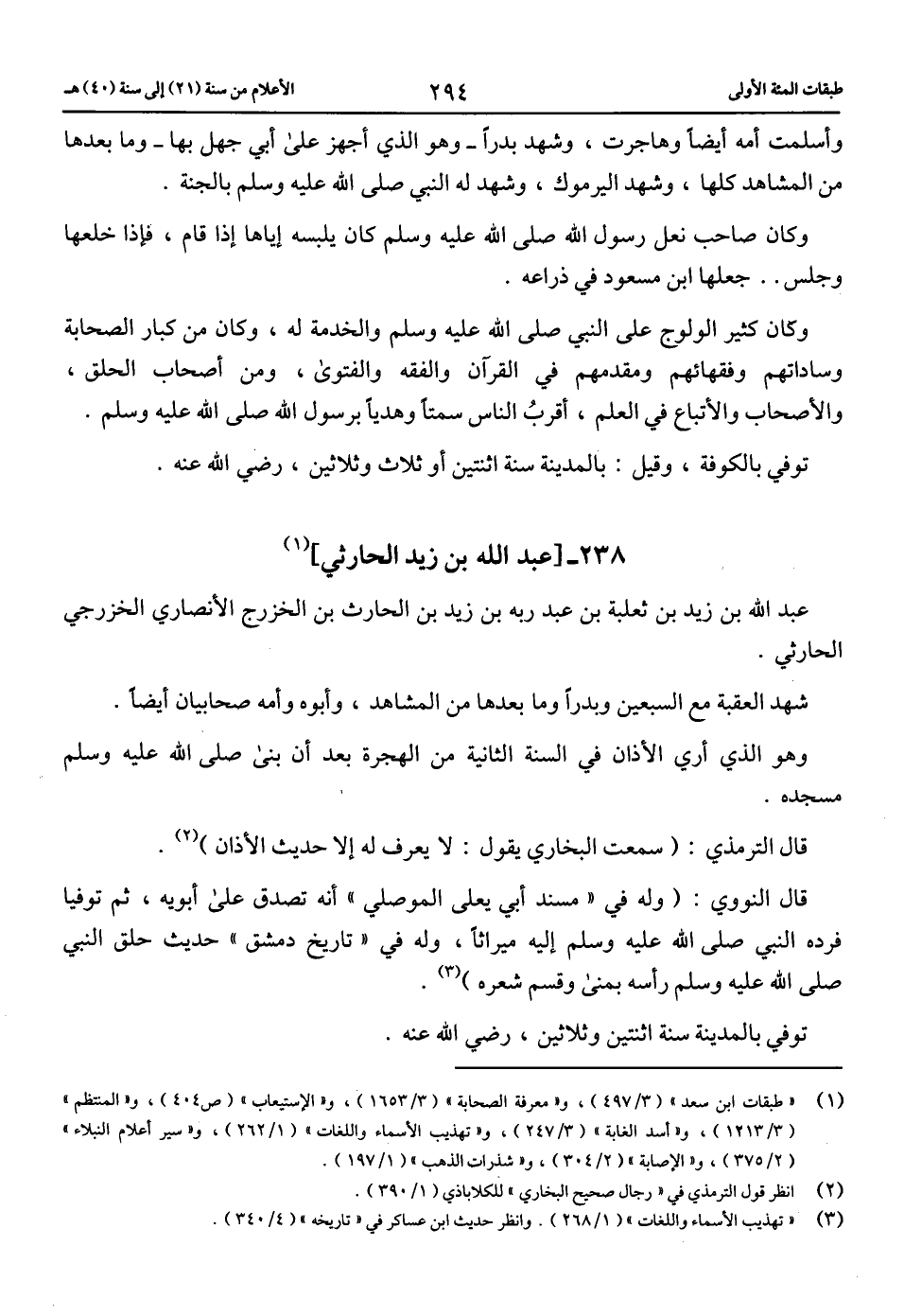(1) «طبقات ابن سعد» (3/ 497)، و «معرفة الصحابة» (3/ 1653)، و «الاستيعاب» (ص 404)، و «المنتظم» (3/ 1213)، و «أسد الغابة» (3/ 247)، و «تهذيب الأسماء واللغات» (1/ 262)، و «سير أعلام النبلاء» (2/ 375)، و «الإصابة» (2/ 304)، و «شذرات الذهب» (1/ 197).