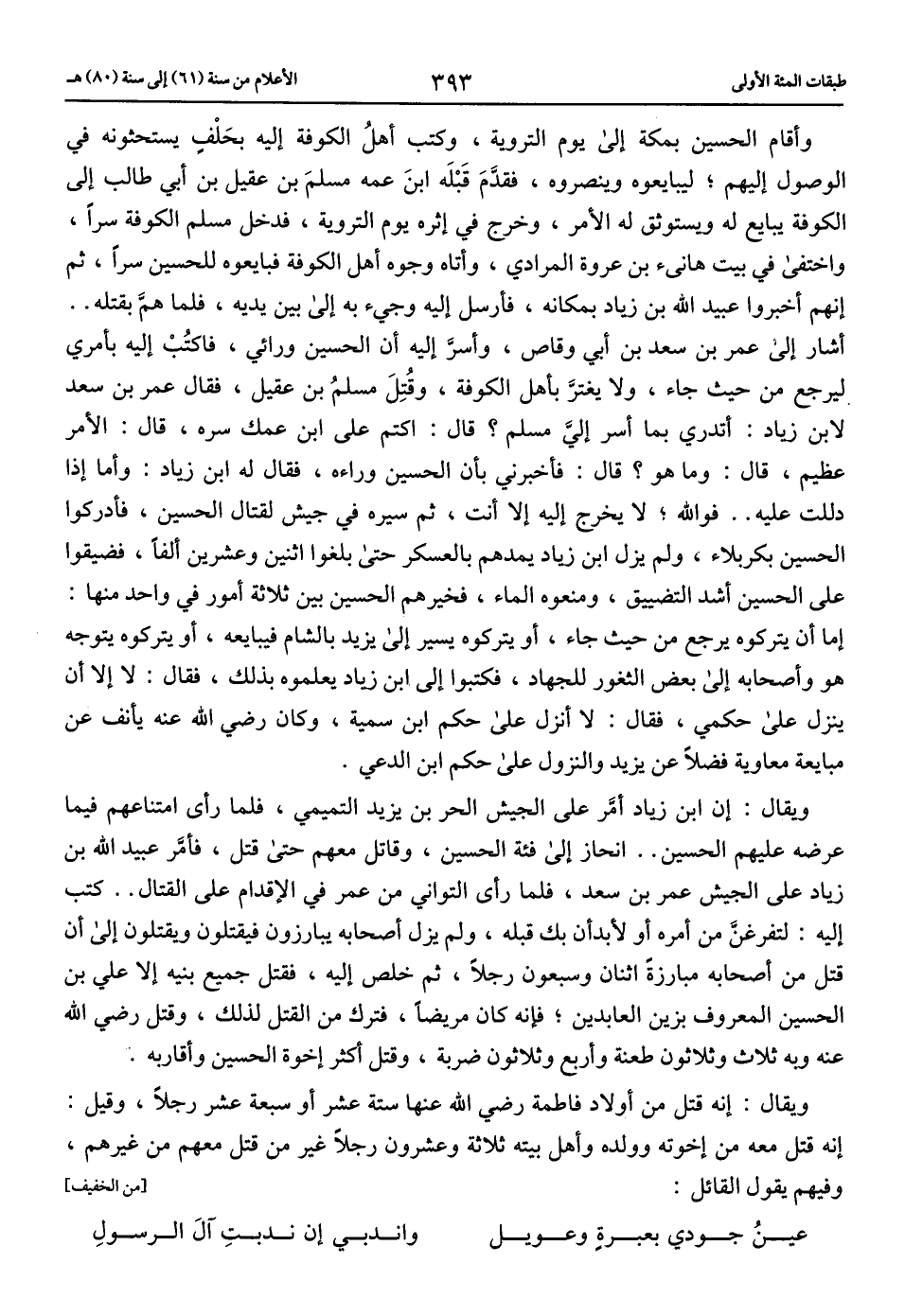 ويقال: إن ابن زياد أمّر على الجيش الحر بن يزيد التميمي، فلما رأى امتناعهم فيما عرضه عليهم الحسين .. انحاز إلى فئة الحسين، وقاتل معهم حتى قتل، فأمّر عبيد الله بن زياد على الجيش عمر بن سعد، فلما رأى التواني من عمر في الإقدام على القتال .. كتب إليه: لتفرغنّ من أمره أو لأبدأنّ بك قبله، ولم يزل أصحابه يبارزون فيقتلون ويقتلون إلى أن قتل من أصحابه مبارزة اثنان وسبعون رجلا، ثم خلص إليه، فقتل جميع بنيه إلا علي بن الحسين المعروف بزين العابدين؛ فإنه كان مريضا، فترك من القتل لذلك، وقتل رضي الله عنه وبه ثلاث وثلاثون طعنة وأربع وثلاثون ضربة، وقتل أكثر إخوة الحسين وأقاربه.