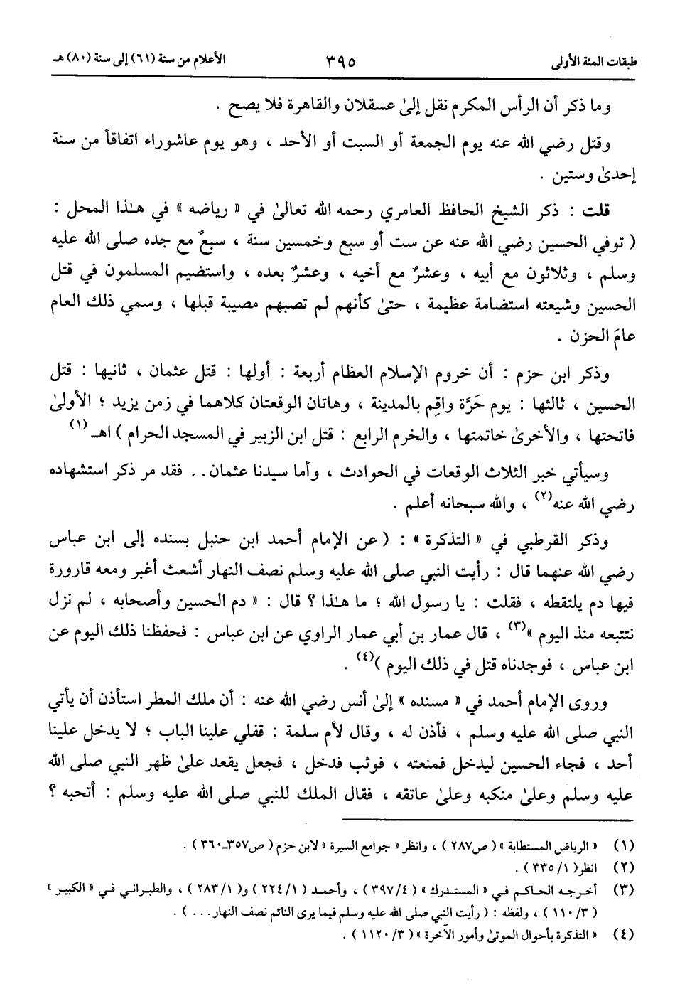 وذكر القرطبي في «التذكرة»: (عن الإمام أحمد ابن حنبل بسنده إلى ابن عباس رضي الله عنهما قال: رأيت النبي صلّى الله عليه وسلم نصف النهار أشعث أغبر ومعه قارورة فيها دم يلتقطه، فقلت: يا رسول الله؛ ما هذا؟ قال: «دم الحسين وأصحابه، لم نزل نتتبعه منذ اليوم» (3)، قال عمار بن أبي عمار الراوي عن ابن عباس: فحفظنا ذلك اليوم عن ابن عباس، فوجدناه قتل في ذلك اليوم) (4).