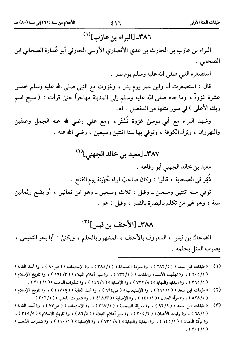 (2) «طبقات ابن سعد» (5/ 265)، و «الاستيعاب» (ص 694)، و «أسد الغابة» (5/ 217)، و «تاريخ الإسلام» (5/ 528)، و «مرآة الجنان» (1/ 145)، و «الإصابة» (3/ 418)، و «شذرات الذهب» (1/ 302).
