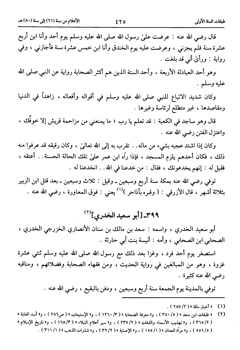 (2) «طبقات ابن سعد» (5/ 350)، و «معرفة الصحابة» (3/ 1260)، و «الاستيعاب» (ص 286)، و «أسد الغابة» (2/ 365)، و «تهذيب الأسماء واللغات» (2/ 237)، و «سير أعلام النبلاء» (3/ 168)، و «تاريخ الإسلام» (5/ 551)، و «مرآة الجنان» (1/ 155)، و «الإصابة» (2/ 32)، و «شذرات الذهب» (1/ 311).