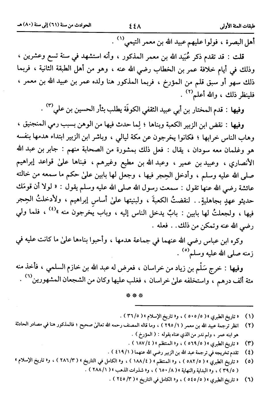 (5) «تاريخ الطبري» (5/ 582)، و «المنتظم» (4/ 188)، و «الكامل في التاريخ» (3/ 286)، و «تاريخ الإسلام» (5/ 39)، و «البداية والنهاية» (8/ 650)، و «شذرات الذهب» (1/ 288).