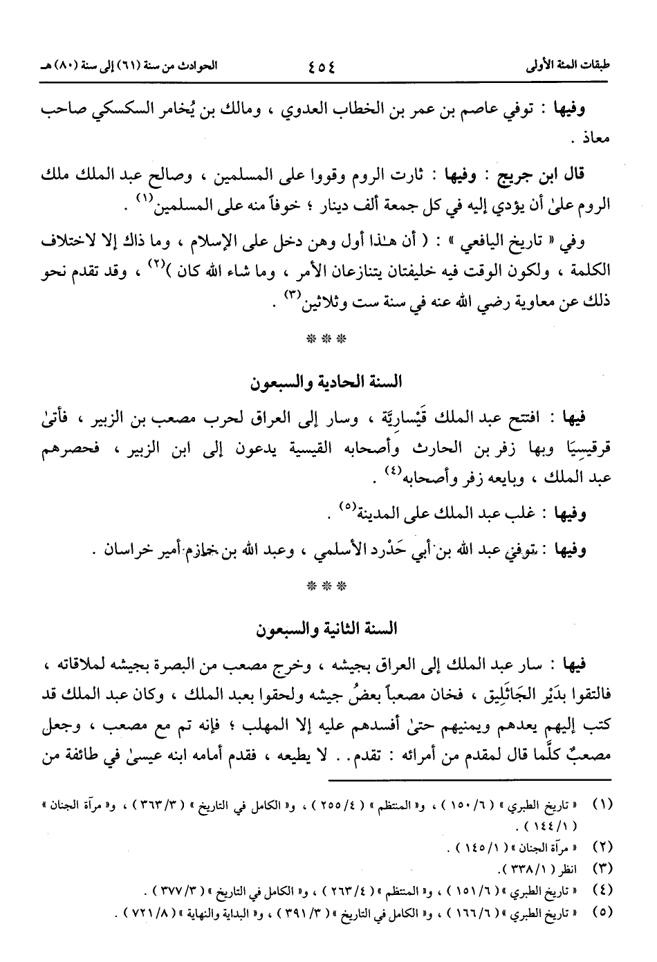 (1) «تاريخ الطبري» (6/ 150)، و «المنتظم» (4/ 255)، و «الكامل في التاريخ» (3/ 363)، و «مرآة الجنان» (1/ 144).