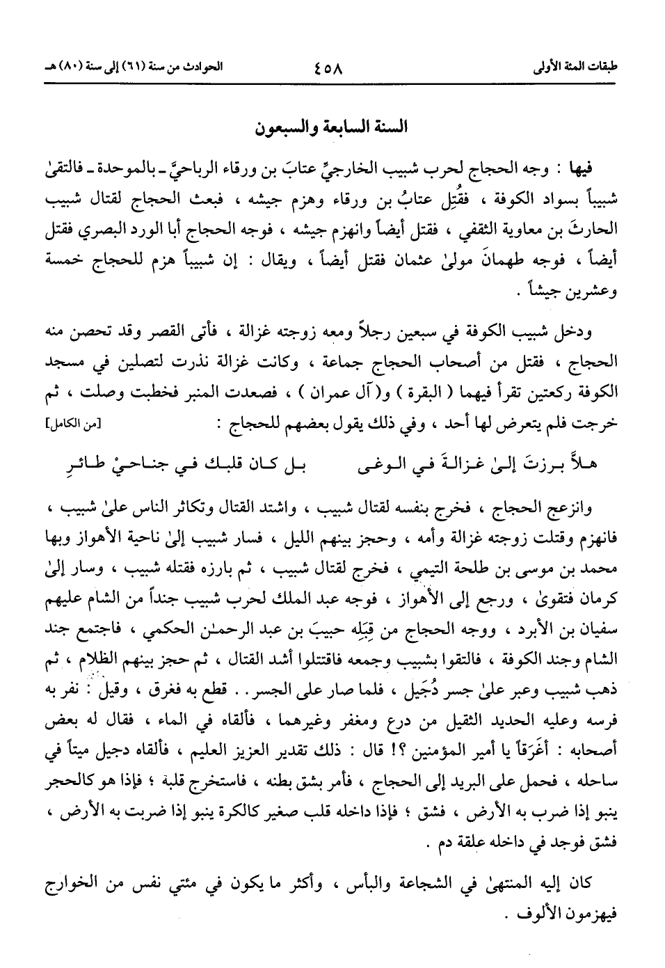 فيها: وجه الحجاج لحرب شبيب الخارجيّ عتاب بن ورقاء الرباحيّ-بالموحدة-فالتقى شبيبا بسواد الكوفة، فقتل عتاب بن ورقاء وهزم جيشه، فبعث الحجاج لقتال شبيب الحارث بن معاوية الثقفي، فقتل أيضا وانهزم جيشه، فوجه الحجاج أبا الورد البصري فقتل أيضا، فوجه طهمان مولى عثمان فقتل أيضا، ويقال: إن شبيبا هزم للحجاج خمسة وعشرين جيشا.