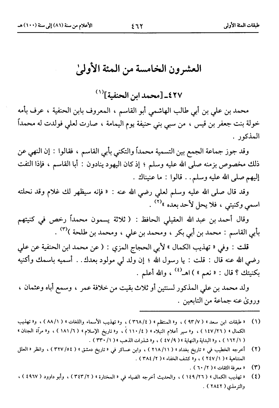 قلت: وفي «تهذيب الكمال» لأبي الحجاج المزي: (عن محمد ابن الحنفية عن علي رضي الله عنه قال: قلت: يا رسول الله؛ إن ولد لي مولود بعدك .. أسميه باسمك وأكنيه بكنيتك؟ قال: «نعم») اهـ (4)، والله أعلم.