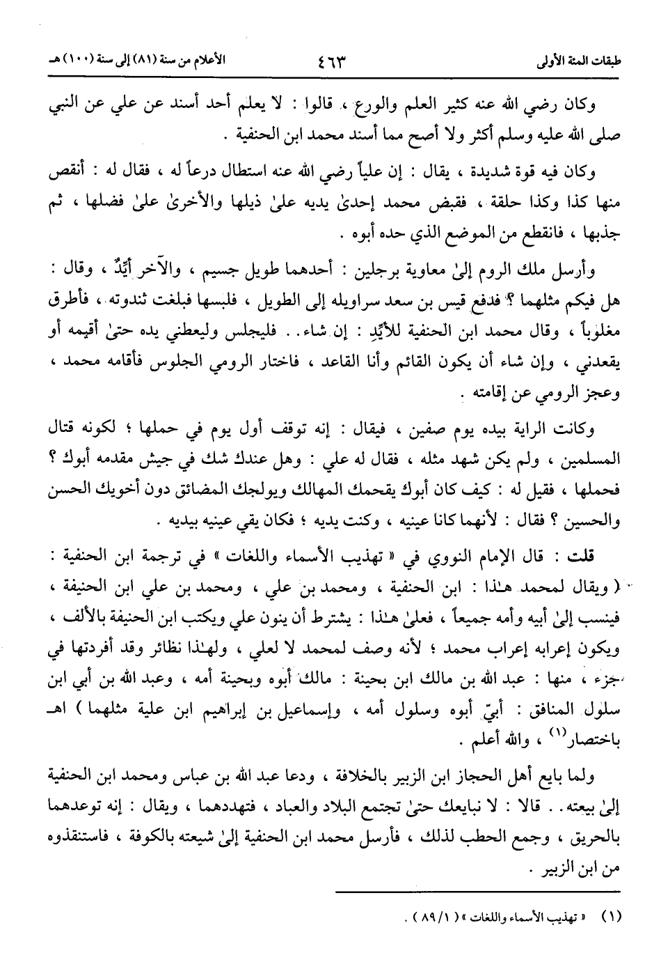 قلت: قال الإمام النووي في «تهذيب الأسماء واللغات» في ترجمة ابن الحنفية: