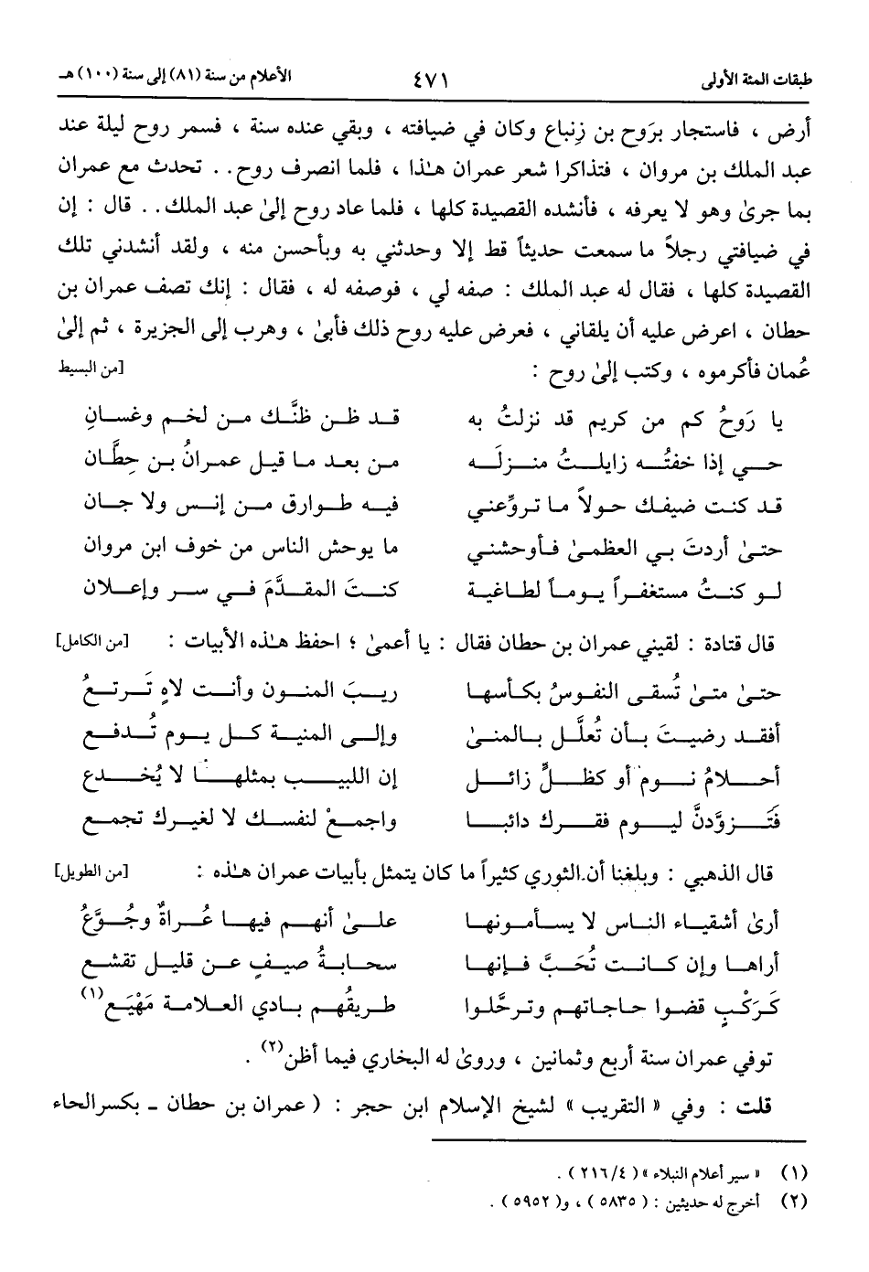 أرض، فاستجار بروح بن زنباع وكان في ضيافته، وبقي عنده سنة، فسمر روح ليلة عند عبد الملك بن مروان، فتذاكرا شعر عمران هذا، فلما انصرف روح .. تحدث مع عمران بما جرى وهو لا يعرفه، فأنشده القصيدة كلها، فلما عاد روح إلى عبد الملك .. قال: إن في ضيافتي رجلا ما سمعت حديثا قط إلا وحدثني به وبأحسن منه، ولقد أنشدني تلك القصيدة كلها، فقال له عبد الملك: صفه لي، فوصفه له، فقال: إنك تصف عمران بن حطان، اعرض عليه أن يلقاني، فعرض عليه روح ذلك فأبى، وهرب إلى الجزيرة، ثم إلى عمان فأكرموه، وكتب إلى روح: [من البسيط]