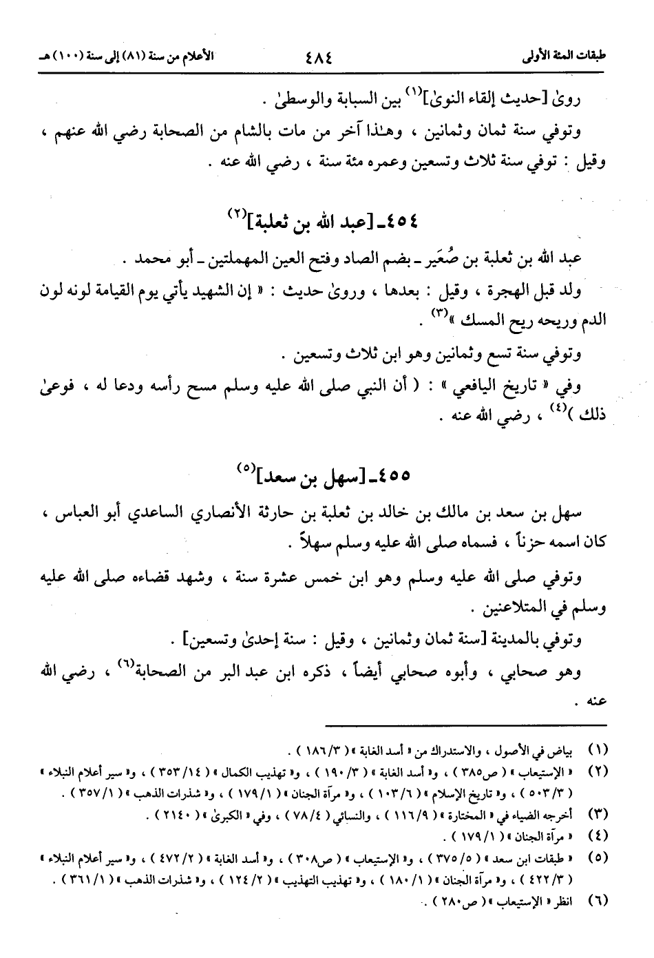 (5) «طبقات ابن سعد» (5/ 375)، و «الاستيعاب» (ص 308)، و «أسد الغابة» (2/ 472)، و «سير أعلام النبلاء» (3/ 422)، و «مرآة الجنان» (1/ 180)، و «تهذيب التهذيب» (2/ 124)، و «شذرات الذهب» (1/ 361).